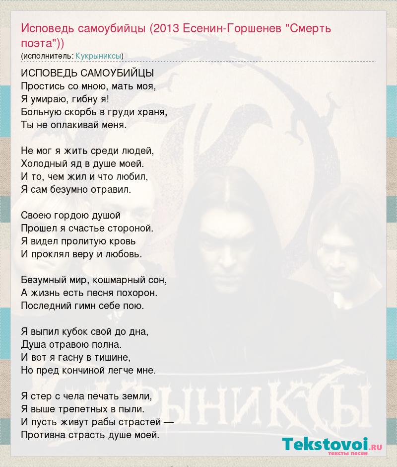 А как ты думаешь, о чем песня "Исповедь самоубийцы (2013 Есенин-Горшенев "Смерть поэта"))" ?