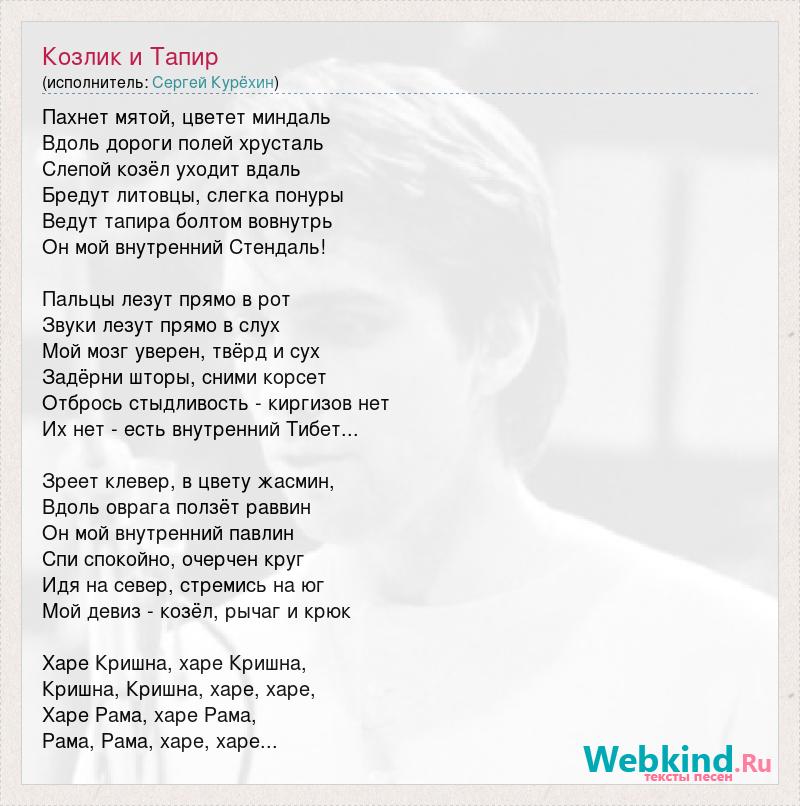 Пахнет мятой, цветет миндаль Вдоль дороги полей хрусталь Слепой козёл уходит вдаль Бредут литовцы, слегка понуры Ведут тапира болтом вовнутрь Он мой внутренний Стендаль! Пальцы лезут прямо в рот Звуки лезут прямо в слух Мой мозг уверен, твёрд и сух Задёрни шторы, сними корсет Отбрось стыдливость - киргизов нет Их нет - есть внутренний Тибет... Зреет клевер, в цвету жасмин, Вдоль оврага ползёт раввин Он мой внутренний павлин Спи спокойно, очерчен круг Идя на север, стремись на юг Мой девиз - козёл, рычаг и крюк Харе Кришна, харе Кришна, Кришна, Кришна, харе, харе, Харе Рама, харе Рама, Рама, Рама, харе, харе...