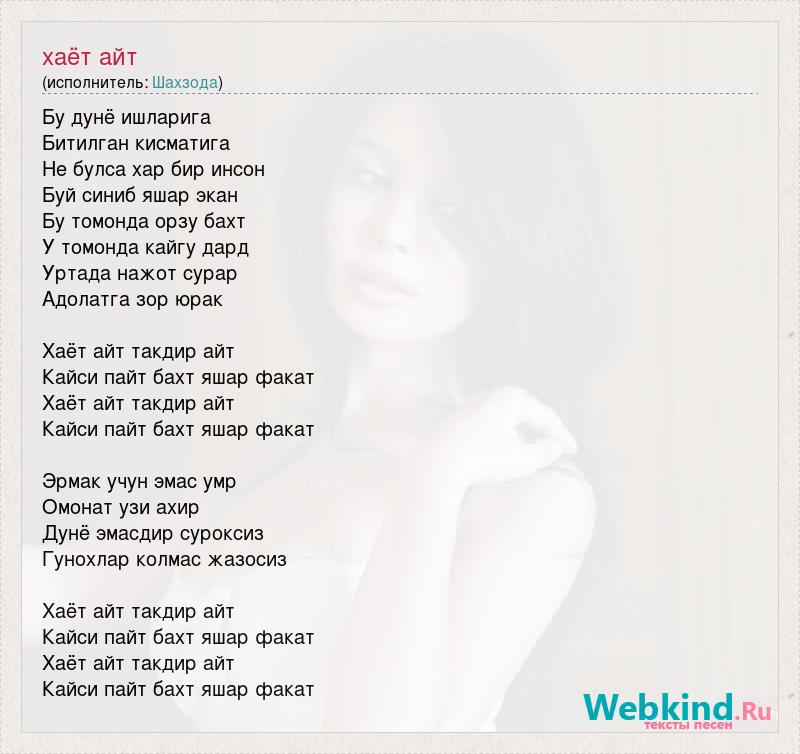 Бу дунё ишларига Битилган кисматига Не булса хар бир инсон Буй синиб яшар экан Бу томонда орзу бахт У томонда кайгу дард Уртада нажот сурар Адолатга зор юрак Хаёт айт такдир айт Кайси пайт бахт яшар факат Хаёт айт такдир айт Кайси пайт бахт яшар факат Эрмак учун эмас умр Омонат узи ахир Дунё эмасдир суроксиз Гунохлар колмас жазосиз Хаёт айт такдир айт Кайси пайт бахт яшар факат Хаёт айт такдир айт Кайси пайт бахт яшар факат