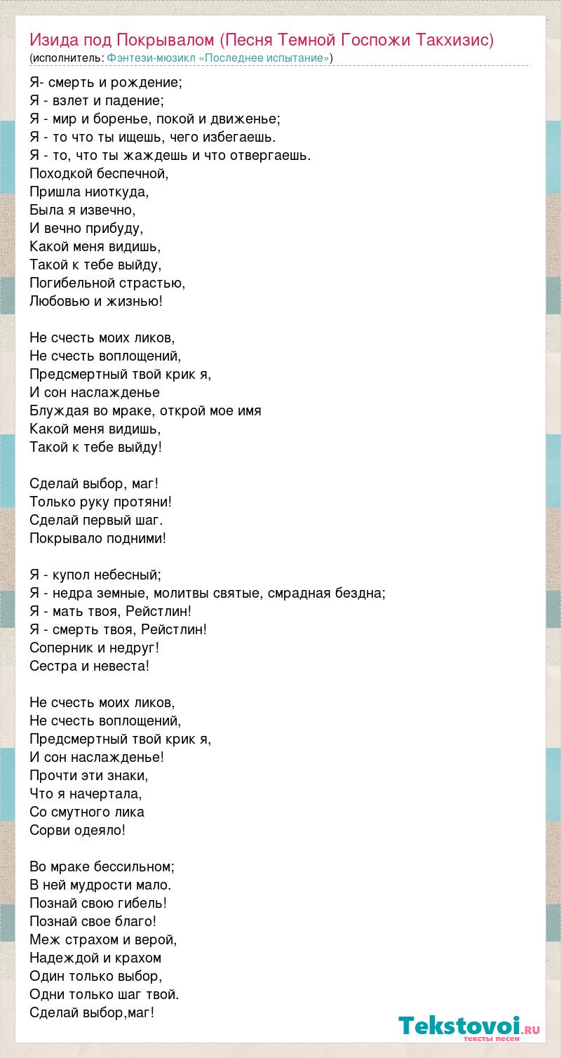 Я- смерть и рождение; Я - взлет и падение; Я - мир и боренье, покой и движенье; Я - то что ты ищешь, чего избегаешь. Я - то, что ты жаждешь и что отвергаешь. Походкой беспечной, Пришла ниоткуда, Была я извечно, И вечно прибуду, Какой меня видишь, Такой к тебе выйду, Погибельной страстью, Любовью и жизнью! Не счесть моих ликов, Не счесть воплощений, Предсмертный твой крик я, И сон наслажденье Блуждая во мраке, открой мое имя Какой меня видишь, Такой к тебе выйду! Сделай выбор, маг! Только руку протяни! Сделай первый шаг. Покрывало подними! Я - купол небесный; Я - недра земные, молитвы святые, смрадная бездна; Я - мать твоя, Рейстлин! Я - смерть твоя, Рейстлин! Соперник и недруг! Сестра и невеста! Не счесть моих ликов, Не счесть воплощений, Предсмертный твой крик я, И сон наслажденье! Прочти эти знаки, Что я начертала, Со смутного лика Сорви одеяло! Во мраке бессильном; В ней мудрости мало. Познай свою гибель! Познай свое благо! Меж страхом и верой, Надеждой и крахом Один только выбор, Одни только шаг твой. Сделай выбор,маг!