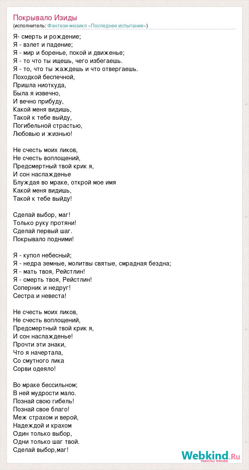Я- смерть и рождение; Я - взлет и падение; Я - мир и боренье, покой и движенье; Я - то что ты ищешь, чего избегаешь. Я - то, что ты жаждешь и что отвергаешь. Походкой беспечной, Пришла ниоткуда, Была я извечно, И вечно прибуду, Какой меня видишь, Такой к тебе выйду, Погибельной страстью, Любовью и жизнью! Не счесть моих ликов, Не счесть воплощений, Предсмертный твой крик я, И сон наслажденье Блуждая во мраке, открой мое имя Какой меня видишь, Такой к тебе выйду! Сделай выбор, маг! Только руку протяни! Сделай первый шаг. Покрывало подними! Я - купол небесный; Я - недра земные, молитвы святые, смрадная бездна; Я - мать твоя, Рейстлин! Я - смерть твоя, Рейстлин! Соперник и недруг! Сестра и невеста! Не счесть моих ликов, Не счесть воплощений, Предсмертный твой крик я, И сон наслажденье! Прочти эти знаки, Что я начертала, Со смутного лика Сорви одеяло! Во мраке бессильном; В ней мудрости мало. Познай свою гибель! Познай свое благо! Меж страхом и верой, Надеждой и крахом Один только выбор, Одни только шаг твой. Сделай выбор,маг!