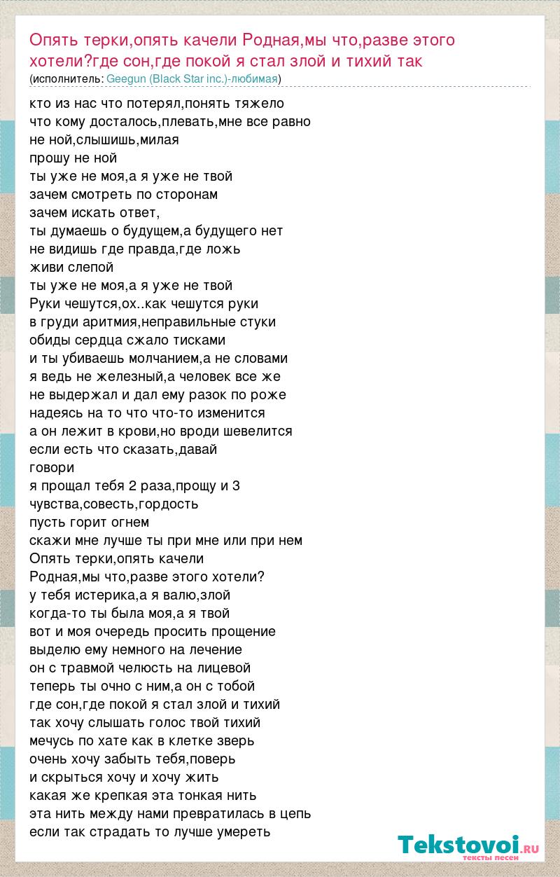 Главная→Исполнители→Geegun (Black Star inc.)-любимая→Опять терки,опять качели Родная,мы что,разве этого хотели?где сон,где покой я ст