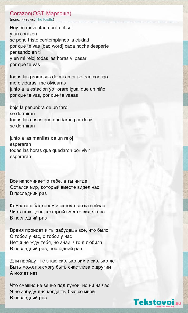 Hoy en mi ventana brilla el sol y un corazon se pone triste contemplando la ciudad por que te vas como cada noche desperte pensando en ti y en mi reloj todas las horas vi pasar por que te vas todas las promesas de mi amor se iran contigo me olvidaras, me olvidaras junto a la estacion yo llorare igual que un niño por que te vas, por que te vaaas bajo la penunbra de un farol se dormiran todas las cosas que quedaron por decir se dormiran junto a las manillas de un reloj esperaran todas las horas que quedaron por vivir espararan Все напоминает о тебе, а ты нигде Остался мир, который вместе видел нас В последний раз Комната с балконом и окном светла сейчас Чиста как день, который вместе видел нас В последний раз Время пройдет и ты забудешь все, что было С тобой у нас, с тобой у нас Нет я не жду тебя, но знай, что я любила В последний раз, последний раз Дни пройдут не знаю сколько зим и сколько лет Быть может я смогу быть счастлива с другим А может нет Что смешно не вечно под луной, но ни на час Я не забуду дня когда ты был со мной В последний раз