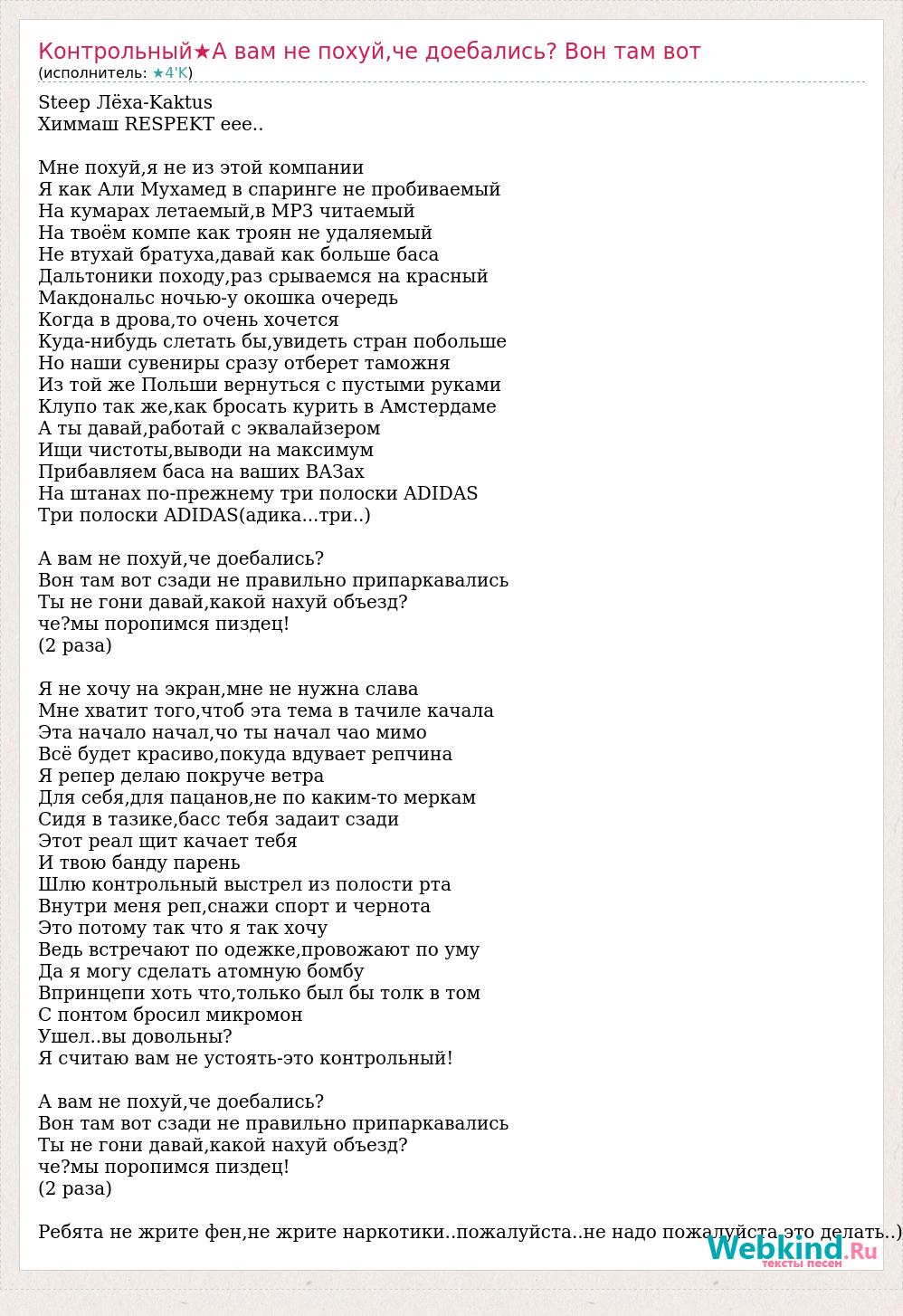 Steep Лёха-Kaktus Химмаш RESPEKT еее.. Мне похуй,я не из этой компании Я как Али Мухамед в спаринге не пробиваемый На кумарах летаемый,в MP3 читаемый На твоём компе как троян не удаляемый Не втухай братуха,давай как больше баса Дальтоники походу,раз срываемся на красный Макдональс ночью-у окошка очередь Когда в дрова,то очень хочется Куда-нибудь слетать бы,увидеть стран побольше Но наши сувениры сразу отберет таможня Из той же Польши вернуться с пустыми руками Клупо так же,как бросать курить в Амстердаме А ты давай,работай с эквалайзером Ищи чистоты,выводи на максимум Прибавляем баса на ваших ВАЗах На штанах по-прежнему три полоски ADIDAS Три полоски ADIDAS(адика...три..) А вам не похуй,че доебались? Вон там вот сзади не правильно припаркавались Ты не гони давай,какой нахуй объезд? че?мы поропимся пиздец! (2 раза) Я не хочу на экран,мне не нужна слава Мне хватит того,чтоб эта тема в тачиле качала Эта начало начал,чо ты начал чао мимо Всё будет красиво,покуда вдувает репчина Я репер делаю покруче ветра Для себя,для пацанов,не по каким-то меркам Сидя в тазике,басс тебя задаит сзади Этот реал щит качает тебя И твою банду парень Шлю контрольный выстрел из полости рта Внутри меня реп,снажи спорт и чернота Это потому так что я так хочу Ведь встречают по одежке,провожают по уму Да я могу сделать атомную бомбу Впринцепи хоть что,только был бы толк в том С понтом бросил микромон Ушел..вы довольны? Я считаю вам не устоять-это контрольный! А вам не похуй,че доебались? Вон там вот сзади не правильно припаркавались Ты не гони давай,какой нахуй объезд? че?мы поропимся пиздец! (2 раза) Ребята не жрите фен,не жрите наркотики..пожалуйста..не надо пожалуйста это делать..)
