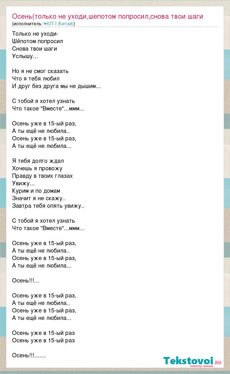 Только не уходи- Шёпотом попросил Снова твои шаги Услышу... Но я не смог сказать Что я тебя любил И друг без друга мы не дышим... С тобой я хотел узнать Что такое "Вместе"...ммм... Осень уже в 15-ый раз, А ты ещё не любила.. Осень уже в 15-ый раз, А ты ещё не любила... Я тебя долго ждал Хочешь я провожу Правду в твоих глазах Увижу... Курим и по домам Значит я не скажу.. Завтра тебя опять увижу.. С тобой я хотел узнать Что такое "Вместе"...ммм... Осень уже в 15-ый раз, А ты ещё не любила.. Осень уже в 15-ый раз, А ты ещё не любила... Осень!!!... Осень уже в 15-ый раз, А ты ещё не любила.. Осень уже в 15-ый раз, А ты ещё не любила... Осень уже в 15-ый раз Осень уже в 15-ый раз Осень!!!.......