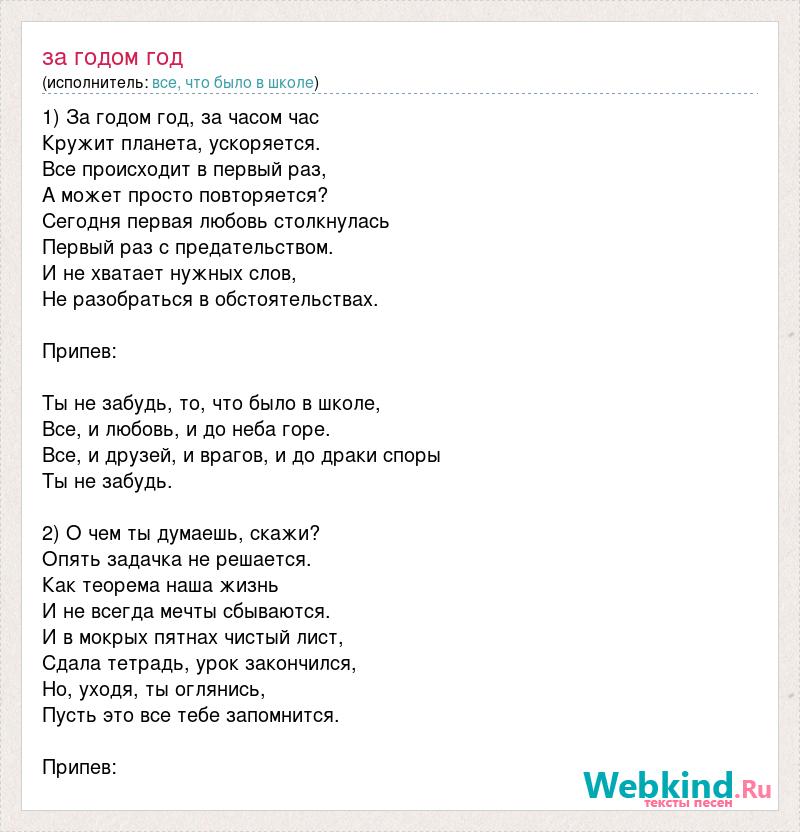 1) За годом год, за часом час Кружит планета, ускоряется. Все происходит в первый раз, А может просто повторяется? Сегодня первая любовь столкнулась Первый раз с предательством. И не хватает нужных слов, Не разобраться в обстоятельствах. Припев: Ты не забудь, то, что было в школе, Все, и любовь, и до неба горе. Все, и друзей, и врагов, и до драки споры Ты не забудь. 2) О чем ты думаешь, скажи? Опять задачка не решается. Как теорема наша жизнь И не всегда мечты сбываются. И в мокрых пятнах чистый лист, Сдала тетрадь, урок закончился, Но, уходя, ты оглянись, Пусть это все тебе запомнится. Припев: