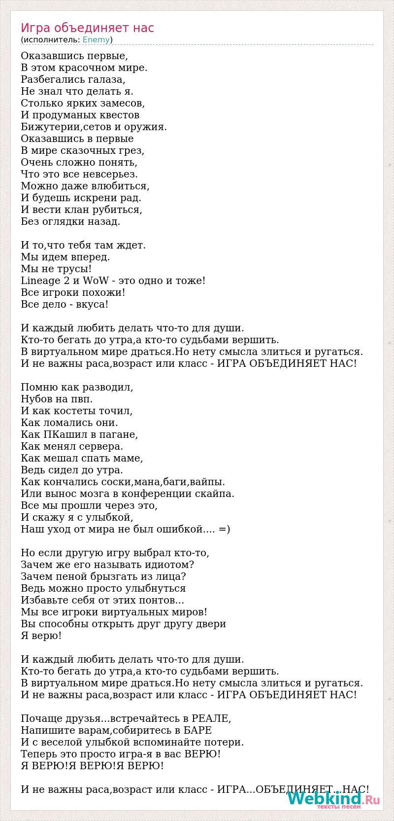 Оказавшись первые, В этом красочном мире. Разбегались галаза, Не знал что делать я. Столько ярких замесов, И продуманых квестов Бижутерии,сетов и оружия. Оказавшись в первые В мире сказочных грез, Очень сложно понять, Что это все невсерьез. Можно даже влюбиться, И будешь искрени рад. И вести клан рубиться, Без оглядки назад. И то,что тебя там ждет. Мы идем вперед. Мы не трусы! Lineage 2 и WoW - это одно и тоже! Все игроки похожи! Все дело - вкуса! И каждый любить делать что-то для души. Кто-то бегать до утра,а кто-то судьбами вершить. В виртуальном мире драться.Но нету смысла злиться и ругаться. И не важны раса,возраст или класс - ИГРА ОБЪЕДИНЯЕТ НАС! Помню как разводил, Нубов на пвп. И как костеты точил, Как ломались они. Как ПКашил в пагане, Как менял сервера. Как мешал спать маме, Ведь сидел до утра. Как кончались соски,мана,баги,вайпы. Или вынос мозга в конференции скайпа. Все мы прошли через это, И скажу я с улыбкой, Наш уход от мира не был ошибкой.... =) Но если другую игру выбрал кто-то, Зачем же его называть идиотом? Зачем пеной брызгать из лица? Ведь можно просто улыбнуться Избавьте себя от этих понтов... Мы все игроки виртуальных миров! Вы способны открыть друг другу двери Я верю! И каждый любить делать что-то для души. Кто-то бегать до утра,а кто-то судьбами вершить. В виртуальном мире драться.Но нету смысла злиться и ругаться. И не важны раса,возраст или класс - ИГРА ОБЪЕДИНЯЕТ НАС! Почаще друзья...встречайтесь в РЕАЛЕ, Напишите варам,собиритесь в БАРЕ И с веселой улыбкой вспоминайте потери. Теперь это просто игра-я в вас ВЕРЮ! Я ВЕРЮ!Я ВЕРЮ!Я ВЕРЮ! И не важны раса,возраст или класс - ИГРА...ОБЪЕДИНЯЕТ...НАС!