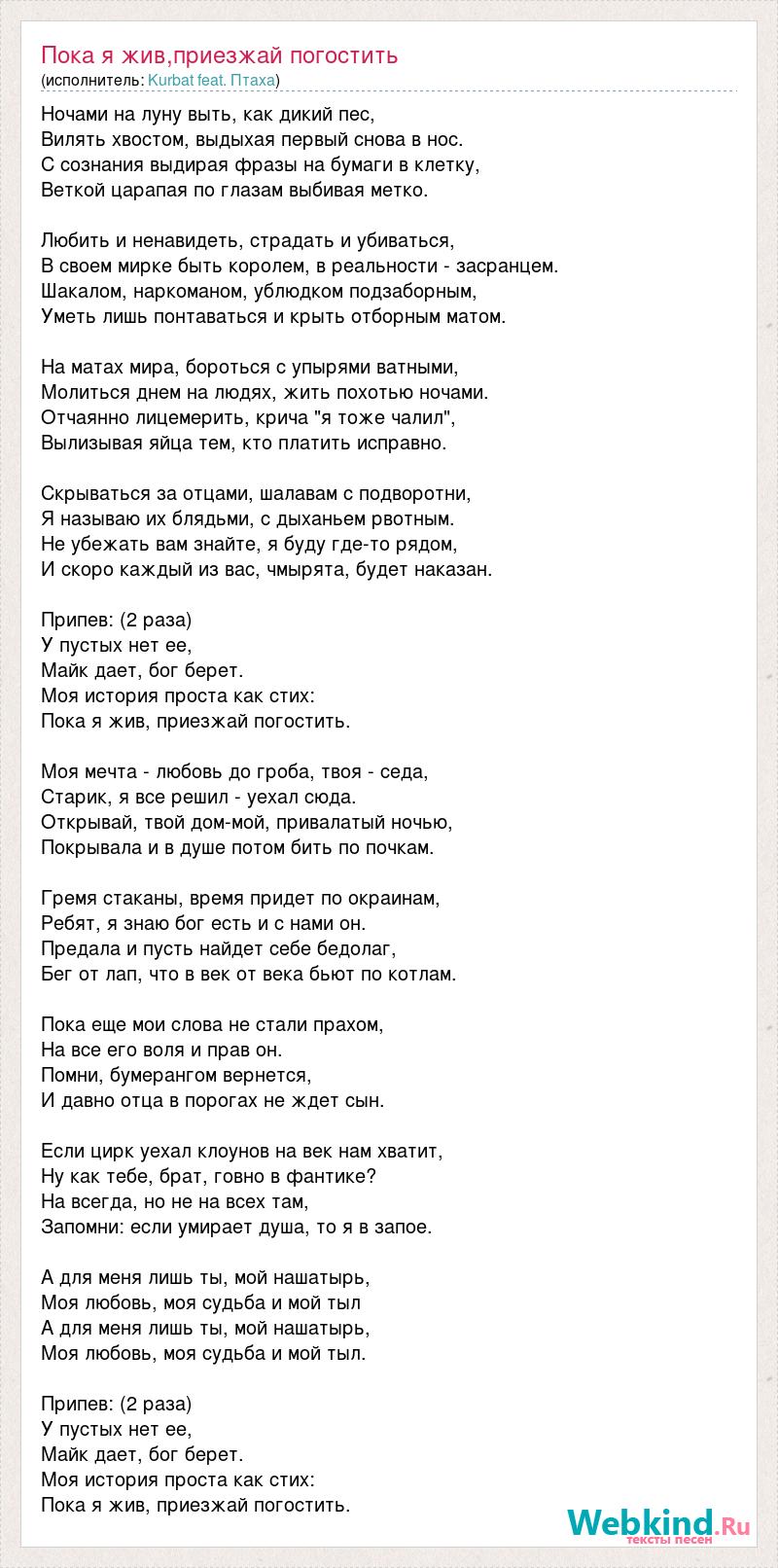 Ночами на луну выть, как дикий пес, Вилять хвостом, выдыхая первый снова в нос. С сознания выдирая фразы на бумаги в клетку, Веткой царапая по глазам выбивая метко. Любить и ненавидеть, страдать и убиваться, В своем мирке быть королем, в реальности - засранцем. Шакалом, наркоманом, ублюдком подзаборным, Уметь лишь понтаваться и крыть отборным матом. На матах мира, бороться с упырями ватными, Молиться днем на людях, жить похотью ночами. Отчаянно лицемерить, крича "я тоже чалил", Вылизывая яйца тем, кто платить исправно. Скрываться за отцами, шалавам с подворотни, Я называю их блядьми, с дыханьем рвотным. Не убежать вам знайте, я буду где-то рядом, И скоро каждый из вас, чмырята, будет наказан. Припев: (2 раза) У пустых нет ее, Майк дает, бог берет. Моя история проста как стих: Пока я жив, приезжай погостить. Моя мечта - любовь до гроба, твоя - седа, Старик, я все решил - уехал сюда. Открывай, твой дом-мой, привалатый ночью, Покрывала и в душе потом бить по почкам. Гремя стаканы, время придет по окраинам, Ребят, я знаю бог есть и с нами он. Предала и пусть найдет себе бедолаг, Бег от лап, что в век от века бьют по котлам. Пока еще мои слова не стали прахом, На все его воля и прав он. Помни, бумерангом вернется, И давно отца в порогах не ждет сын. Если цирк уехал клоунов на век нам хватит, Ну как тебе, брат, говно в фантике? На всегда, но не на всех там, Запомни: если умирает душа, то я в запое. А для меня лишь ты, мой нашатырь, Моя любовь, моя судьба и мой тыл А для меня лишь ты, мой нашатырь, Моя любовь, моя судьба и мой тыл. Припев: (2 раза) У пустых нет ее, Майк дает, бог берет. Моя история проста как стих: Пока я жив, приезжай погостить.