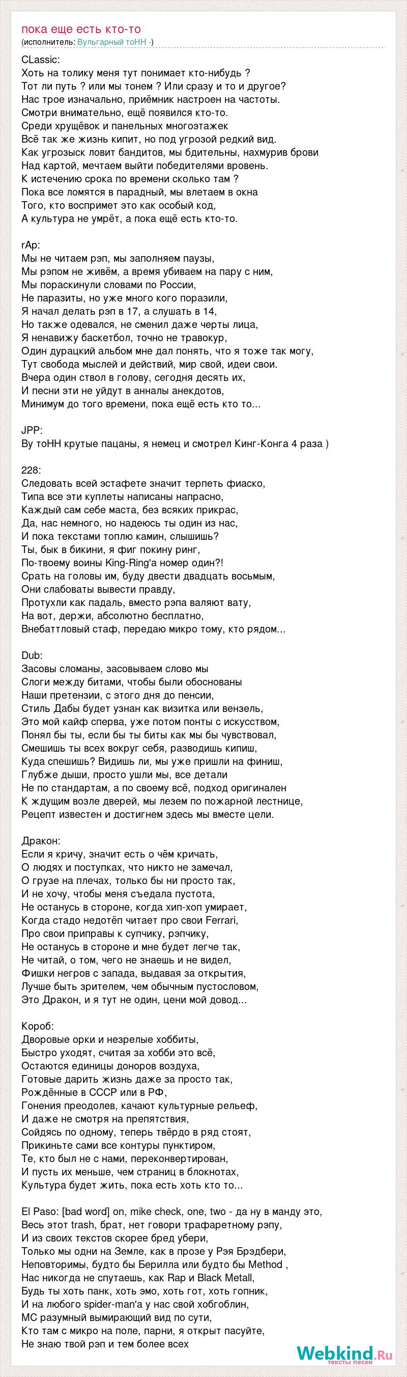 CLassic: Хоть на толику меня тут понимает кто-нибудь ? Тот ли путь ? или мы тонем ? Или сразу и то и другое? Нас трое изначально, приёмник настроен на частоты. Смотри внимательно, ещё появился кто-то. Среди хрущёвок и панельных многоэтажек Всё так же жизнь кипит, но под угрозой редкий вид. Как угрозыск ловит бандитов, мы бдительны, нахмурив брови Над картой, мечтаем выйти победителями вровень. К истечению срока по времени сколько там ? Пока все ломятся в парадный, мы влетаем в окна Того, кто воспримет это как особый код, А культура не умрёт, а пока ещё есть кто-то. rAp: Мы не читаем рэп, мы заполняем паузы, Мы рэпом не живём, а время убиваем на пару с ним, Мы пораскинули словами по России, Не паразиты, но уже много кого поразили, Я начал делать рэп в 17, а слушать в 14, Но также одевался, не сменил даже черты лица, Я ненавижу баскетбол, точно не травокур, Один дурацкий альбом мне дал понять, что я тоже так могу, Тут свобода мыслей и действий, мир свой, идеи свои. Вчера один ствол в голову, сегодня десять их, И песни эти не уйдут в анналы анекдотов, Минимум до того времени, пока ещё есть кто то... JPP: Ву тоНН крутые пацаны, я немец и смотрел Кинг-Конга 4 раза ) 228: Следовать всей эстафете значит терпеть фиаско, Типа все эти куплеты написаны напрасно, Каждый сам себе маста, без всяких прикрас, Да, нас немного, но надеюсь ты один из нас, И пока текстами топлю камин, слышишь? Ты, бык в бикини, я фиг покину ринг, По-твоему воины King-Ring'а номер один?! Срать на головы им, буду двести двадцать восьмым, Они слабоваты вывести правду, Протухли как падаль, вместо рэпа валяют вату, На вот, держи, абсолютно бесплатно, Внебаттловый стаф, передаю микро тому, кто рядом... Dub: Засовы сломаны, засовываем слово мы Слоги между битами, чтобы были обоснованы Наши претензии, с этого дня до пенсии, Стиль Дабы будет узнан как визитка или вензель, Это мой кайф сперва, уже потом понты с искусством, Понял бы ты, если бы ты биты как мы бы чувствовал, Смешишь ты всех вокруг себя, разводишь кипиш, Куда спешишь? Видишь ли, мы уже пришли на финиш, Глубже дыши, просто ушли мы, все детали Не по стандартам, а по своему всё, подход оригинален К ждущим возле дверей, мы лезем по пожарной лестнице, Рецепт известен и достигнем здесь мы вместе цели. Дракон: Если я кричу, значит есть о чём кричать, О людях и поступках, что никто не замечал, О грузе на плечах, только бы ни просто так, И не хочу, чтобы меня съедала пустота, Не останусь в стороне, когда хип-хоп умирает, Когда стадо недотёп читает про свои Ferrari, Про свои приправы к супчику, рэпчику, Не останусь в стороне и мне будет легче так, Не читай, о том, чего не знаешь и не видел, Фишки негров с запада, выдавая за открытия, Лучше быть зрителем, чем обычным пустословом, Это Дракон, и я тут не один, цени мой довод... Короб: Дворовые орки и незрелые хоббиты, Быстро уходят, считая за хобби это всё, Остаются единицы доноров воздуха, Готовые дарить жизнь даже за просто так, Рождённые в СССР или в РФ, Гонения преодолев, качают культурные рельеф, И даже не смотря на препятствия, Сойдясь по одному, теперь твёрдо в ряд стоят, Прикиньте сами все контуры пунктиром, Те, кто был не с нами, переконвертирован, И пусть их меньше, чем страниц в блокнотах, Культура будет жить, пока есть хоть кто то... El Paso: [bad word] on, mike check, one, two - да ну в манду это, Весь этот trash, брат, нет говори трафаретному рэпу, И из своих текстов скорее бред убер