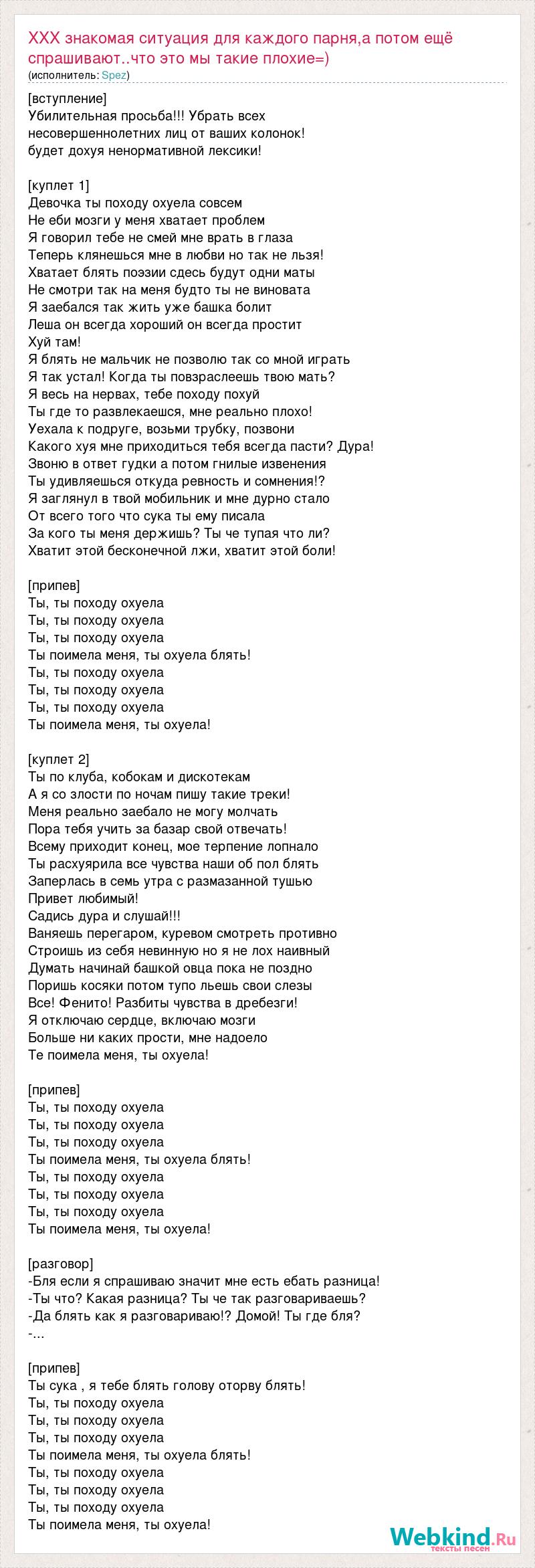 [вступление] Убилительная просьба!!! Убрать всех несовершеннолетних лиц от ваших колонок! будет дохуя ненормативной лексики! [куплет 1] Девочка ты походу охуела совсем Не еби мозги у меня хватает проблем Я говорил тебе не смей мне врать в глаза Теперь клянешься мне в любви но так не льзя! Хватает блять поэзии сдесь будут одни маты Не смотри так на меня будто ты не виновата Я заебался так жить уже башка болит Леша он всегда хороший он всегда простит Хуй там! Я блять не мальчик не позволю так со мной играть Я так устал! Когда ты повзраслеешь твою мать? Я весь на нервах, тебе походу похуй Ты где то развлекаешся, мне реально плохо! Уехала к подруге, возьми трубку, позвони Какого хуя мне приходиться тебя всегда пасти? Дура! Звоню в ответ гудки а потом гнилые извенения Ты удивляешься откуда ревность и сомнения!? Я заглянул в твой мобильник и мне дурно стало От всего того что сука ты ему писала За кого ты меня держишь? Ты че тупая что ли? Хватит этой бесконечной лжи, хватит этой боли! [припев] Ты, ты походу охуела Ты, ты походу охуела Ты, ты походу охуела Ты поимела меня, ты охуела блять! Ты, ты походу охуела Ты, ты походу охуела Ты, ты походу охуела Ты поимела меня, ты охуела! [куплет 2] Ты по клуба, кобокам и дискотекам А я со злости по ночам пишу такие треки! Меня реально заебало не могу молчать Пора тебя учить за базар свой отвечать! Всему приходит конец, мое терпение лопнало Ты расхуярила все чувства наши об пол блять Заперлась в семь утра с размазанной тушью Привет любимый! Садись дура и слушай!!! Ваняешь перегаром, куревом смотреть противно Строишь из себя невинную но я не лох наивный Думать начинай башкой овца пока не поздно Поришь косяки потом тупо льешь свои слезы Все! Фенито! Разбиты чувства в дребезги! Я отключаю сердце, включаю мозги Больше ни каких прости, мне надоело Те поимела меня, ты охуела! [припев] Ты, ты походу охуела Ты, ты походу охуела Ты, ты походу охуела Ты поимела меня, ты охуела блять! Ты, ты походу охуела Ты, ты походу охуела Ты, ты походу охуела Ты поимела меня, ты охуела! [разговор] -Бля если я спрашиваю значит мне есть ебать разница! -Ты что? Какая разница? Ты че так разговариваешь? -Да блять как я разговариваю!? Домой! Ты где бля? -... [припев] Ты сука , я тебе блять голову оторву блять! Ты, ты походу охуела Ты, ты походу охуела Ты, ты походу охуела Ты поимела меня, ты охуела блять! Ты, ты походу охуела Ты, ты походу охуела Ты, ты походу охуела Ты поимела меня, ты охуела!