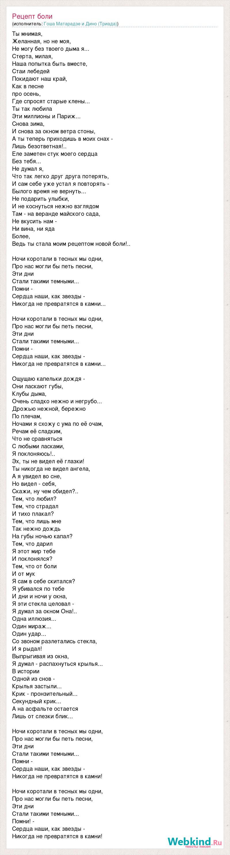 Ты мнимая, Желанная, но не моя, Не могу без твоего дыма я... Стерта, милая, Наша попытка быть вместе, Стаи лебедей Покидают наш край, Как в песне про осень, Где спросят старые клены... Ты так любила Эти миллионы и Париж... Снова зима, И снова за окном ветра стоны, А ты теперь приходишь в моих снах - Лишь безответная!.. Еле заметен стук моего сердца Без тебя... Не думал я, Что так легко друг друга потерять, И сам себе уже устал я повторять - Былого время не вернуть... Не подарить улыбки, И не коснуться нежно взглядом Там - на веранде майского сада, Не вкусить нам - Ни вина, ни яда Более, Ведь ты стала моим рецептом новой боли!.. Ночи коротали в тесных мы одни, Про нас могли бы петь песни, Эти дни Стали такими темными... Помни - Сердца наши, как звезды - Никогда не превратятся в камни... Ночи коротали в тесных мы одни, Про нас могли бы петь песни, Эти дни Стали такими темными... Помни - Сердца наши, как звезды - Никогда не превратятся в камни... Ощущаю капельки дождя - Они ласкают губы, Клубы дыма, Очень сладко нежно и негрубо... Дрожью нежной, бережно По плечам, Ночами я схожу с ума по её очам, Речам её сладким, Что не сравняться С любыми ласками, Я поклоняюсь!.. Эх, ты не видел её глазки! Ты никогда не видел ангела, А я увидел во сне, Но видел - себя, Скажи, ну чем обидел?.. Тем, что любил? Тем, что страдал И тихо плакал? Тем, что лишь мне Так нежно дождь На губы ночью капал? Тем, что дарил Я этот мир тебе И поклонялся? Тем, что от боли И от мук Я сам в себе скитался? Я убивался по тебе И дни и ночи у окна, Я эти стекла целовал - Я думал за окном Она!.. Одна иллюзия... Один мираж... Один удар... Со звоном разлетались стекла, И я рыдал! Выпрыгивая из окна, Я думал - распахнуться крылья... В истории Одной из снов - Крылья застыли... Крик - пронзительный... Секундный крик... А на асфальте остается Лишь от слезки блик... Ночи коротали в тесных мы одни, Про нас могли бы петь песни, Эти дни Стали такими темными... Помни - Сердца наши, как звезды - Никогда не превратятся в камни! Ночи коротали в тесных мы одни, Про нас могли бы петь песни, Эти дни Стали такими темными... Помни! - Сердца наши, как звезды - Никогда не превратятся в камни!