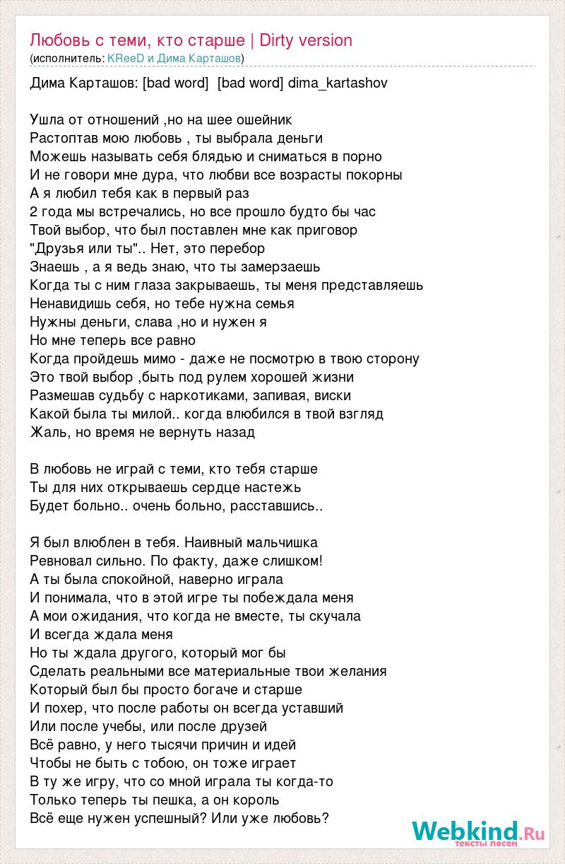 Дима Карташов: [bad word] [bad word] dima_kartashov Ушла от отношений ,но на шее ошейник Растоптав мою любовь , ты выбрала деньги Можешь называть себя блядью и сниматься в порно И не говори мне дура, что любви все возрасты покорны А я любил тебя как в первый раз 2 года мы встречались, но все прошло будто бы час Твой выбор, что был поставлен мне как приговор "Друзья или ты".. Нет, это перебор Знаешь , а я ведь знаю, что ты замерзаешь Когда ты с ним глаза закрываешь, ты меня представляешь Ненавидишь себя, но тебе нужна семья Нужны деньги, слава ,но и нужен я Но мне теперь все равно Когда пройдешь мимо - даже не посмотрю в твою сторону Это твой выбор ,быть под рулем хорошей жизни Размешав судьбу с наркотиками, запивая, виски Какой была ты милой.. когда влюбился в твой взгляд Жаль, но время не вернуть назад В любовь не играй с теми, кто тебя старше Ты для них открываешь сердце настежь Будет больно.. очень больно, расставшись.. Я был влюблен в тебя. Наивный мальчишка Ревновал сильно. По факту, даже слишком! А ты была спокойной, наверно играла И понимала, что в этой игре ты побеждала меня А мои ожидания, что когда не вместе, ты скучала И всегда ждала меня Но ты ждала другого, который мог бы Сделать реальными все материальные твои желания Который был бы просто богаче и старше И похер, что после работы он всегда уставший Или после учебы, или после друзей Всё равно, у него тысячи причин и идей Чтобы не быть с тобою, он тоже играет В ту же игру, что со мной играла ты когда-то Только теперь ты пешка, а он король Всё еще нужен успешный? Или уже любовь?