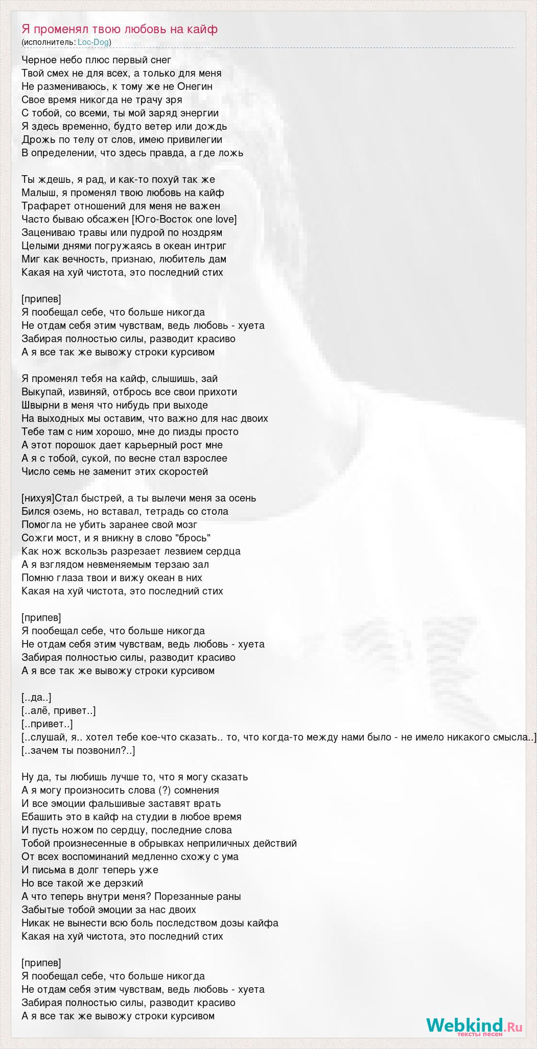 Черное небо плюс первый снег Твой смех не для всех, а только для меня Не размениваюсь, к тому же не Онегин Свое время никогда не трачу зря С тобой, со всеми, ты мой заряд энергии Я здесь временно, будто ветер или дождь Дрожь по телу от слов, имею привилегии В определении, что здесь правда, а где ложь Ты ждешь, я рад, и как-то похуй так же Малыш, я променял твою любовь на кайф Трафарет отношений для меня не важен Часто бываю обсажен [Юго-Восток one love] Зацениваю травы или пудрой по ноздрям Целыми днями погружаясь в океан интриг Миг как вечность, признаю, любитель дам Какая на хуй чистота, это последний стих [припев] Я пообещал себе, что больше никогда Не отдам себя этим чувствам, ведь любовь - хуета Забирая полностью силы, разводит красиво А я все так же вывожу строки курсивом Я променял тебя на кайф, слышишь, зай Выкупай, извиняй, отбрось все свои прихоти Швырни в меня что нибудь при выходе На выходных мы оставим, что важно для нас двоих Тебе там с ним хорошо, мне до пизды просто А этот порошок дает карьерный рост мне А я с тобой, сукой, по весне стал взрослее Число семь не заменит этих скоростей [нихуя]Стал быстрей, а ты вылечи меня за осень Бился оземь, но вставал, тетрадь со стола Помогла не убить заранее свой мозг Сожги мост, и я вникну в слово "брось" Как нож вскользь разрезает лезвием сердца А я взглядом невменяемым терзаю зал Помню глаза твои и вижу океан в них Какая на хуй чистота, это последний стих [припев] Я пообещал себе, что больше никогда Не отдам себя этим чувствам, ведь любовь - хуета Забирая полностью силы, разводит красиво А я все так же вывожу строки курсивом [..да..] [..алё, привет..] [..привет..] [..слушай, я.. хотел тебе кое-что сказать.. то, что когда-то между нами было - не имело никакого смысла..] [..зачем ты позвонил?..] Ну да, ты любишь лучше то, что я могу сказать А я могу произносить слова (?) сомнения И все эмоции фальшивые заставят врать Ебашить это в кайф на студии в любое время И пусть ножом по сердцу, последние слова Тобой произнесенные в обрывках неприличных действий От всех воспоминаний медленно схожу с ума И письма в долг теперь уже Но все такой же дерзкий А что теперь внутри меня? Порезанные раны Забытые тобой эмоции за нас двоих Никак не вынести всю боль последством дозы кайфа Какая на хуй чистота, это последний стих [припев] Я пообещал себе, что больше никогда Не отдам себя этим чувствам, ведь любовь - хуета Забирая полностью силы, разводит красиво А я все так же вывожу строки курсивом
