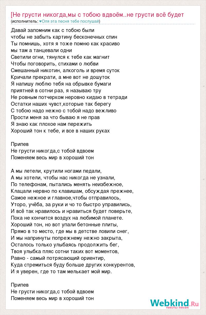 Давай запомним как с тобою были чтобы не забыть картину бесконечных спин Ты помнишь, хотя я тоже помню как красиво мы там а танцевали одни Светили огни, тянулся к тебе как магнит Чтобы поговорить, стихами о любви Смешанный никотин, алкоголь и время суток Кричали прекрати, а мне вот не дошуток Я напишу люблю тебя на обрывке бумаги приятней в сотни раз, я называю тру Не ровным потчерком неровно кидаю в тетради Остатки наших чувст,которые так берегу С тобою надо нежно с тобой надо вежливо Прости меня за что бываю я не прав Я знаю как плохое нам пережить Хороший тон к тебе, и все в наших руках Припев Не грусти никогда,с тобой вдвоем Поменяем весь мир в хороший тон А мы летели, крутили ногами педали, А мы хотели, чтобы нас никогда не узнали, По телефонам, пытались менять неизбежное, Клацали нервно по клавишам, обсуждая прежнее, Самое нежное и главное,чтобы отправилось, Уторо, учёба, за руки и чо то быстро управились, И всё так нравилось и нравиться будет поверьте, Пока не кончится воздух на любимой планете. Хороший тон, но вот упали бетонные плиты, Прямо в то место, где мы в детстве ловили снег, И мы напринуты попрежнему нежно закрыта, Осталось только улыбаясь продолжить бег, Твоя улыбка пляс сотни таких вот моментов, Равно - самый потрясающий ориентир, Куда стремиться буду больше других конкурентов, И я уверен, где то там мелькает мой мир. Припев Не грусти никогда,с тобой вдвоем Поменяем весь мир в хороший тон