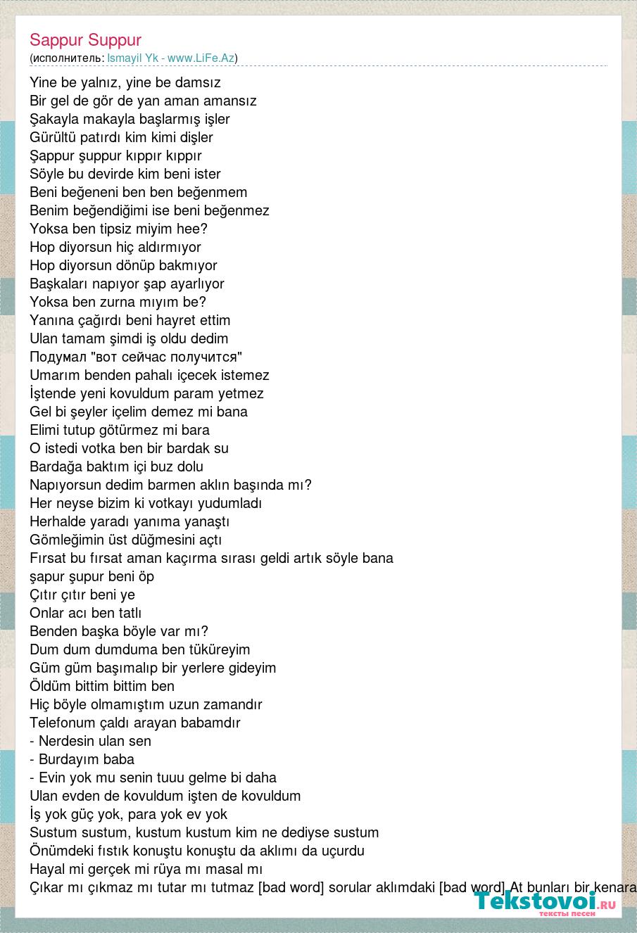 Yine be yalnız, yine be damsız Bir gel de gör de yan aman amansız Şakayla makayla başlarmış işler Gürültü patırdı kim kimi dişler Şappur şuppur kıppır kıppır Söyle bu devirde kim beni ister Beni beğeneni ben ben beğenmem Benim beğendiğimi ise beni beğenmez Yoksa ben tipsiz miyim hee? Hop diyorsun hiç aldırmıyor Hop diyorsun dönüp bakmıyor Başkaları napıyor şap ayarlıyor Yoksa ben zurna mıyım be? Yanına çağırdı beni hayret ettim Ulan tamam şimdi iş oldu dedim Подумал "вот сейчас получится" Umarım benden pahalı içecek istemez İştende yeni kovuldum param yetmez Gel bi şeyler içelim demez mi bana Elimi tutup götürmez mi bara O istedi votka ben bir bardak su Bardağa baktım içi buz dolu Napıyorsun dedim barmen aklın başında mı? Her neyse bizim ki votkayı yudumladı Herhalde yaradı yanıma yanaştı Gömleğimin üst düğmesini açtı Fırsat bu fırsat aman kaçırma sırası geldi artık söyle bana şapur şupur beni öp Çıtır çıtır beni ye Onlar acı ben tatlı Benden başka böyle var mı? Dum dum dumduma ben tüküreyim Güm güm başımalıp bir yerlere gideyim Öldüm bittim bittim ben Hiç böyle olmamıştım uzun zamandır Telefonum çaldı arayan babamdır - Nerdesin ulan sen - Burdayım baba - Evin yok mu senin tuuu gelme bi daha Ulan evden de kovuldum işten de kovuldum İş yok güç yok, para yok ev yok Sustum sustum, kustum kustum kim ne dediyse sustum Önümdeki fıstık konuştu konuştu da aklımı da uçurdu Hayal mi gerçek mi rüya mı masal mı Çıkar mı çıkmaz mı tutar mı tutmaz Sorular sorular aklımdaki sorular At bunları bir kenara