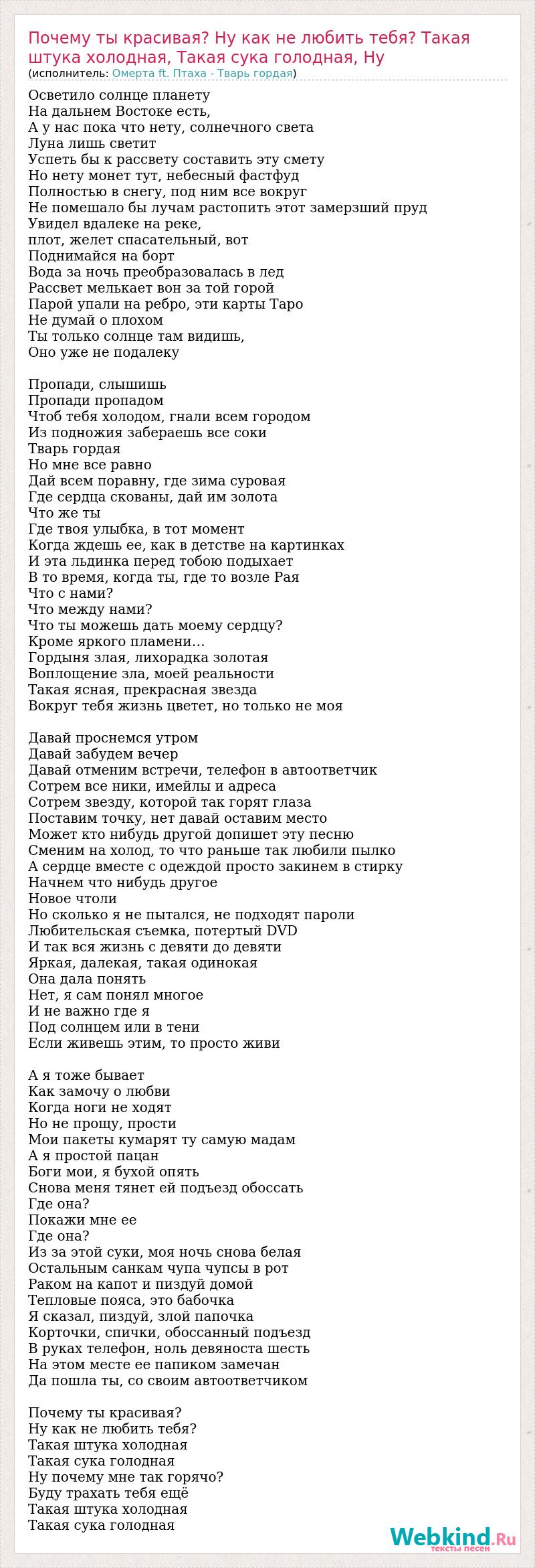 Главная→Исполнители→Омерта ft. Птаха - Тварь гордая→Почему ты красивая? Ну как не любить тебя? Такая штука холодная, Такая сука