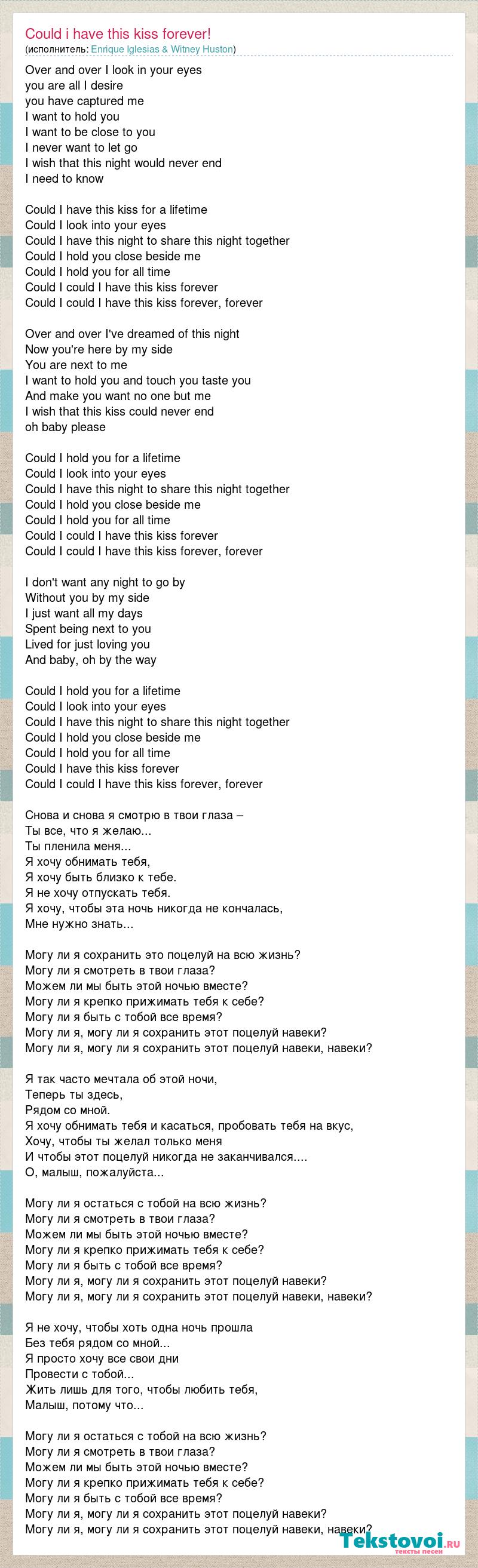 Over and over I look in your eyes you are all I desire you have captured me I want to hold you I want to be close to you I never want to let go I wish that this night would never end I need to know Could I have this kiss for a lifetime Could I look into your eyes Could I have this night to share this night together Could I hold you close beside me Could I hold you for all time Could I could I have this kiss forever Could I could I have this kiss forever, forever Over and over I've dreamed of this night Now you're here by my side You are next to me I want to hold you and touch you taste you And make you want no one but me I wish that this kiss could never end oh baby please Could I hold you for a lifetime Could I look into your eyes Could I have this night to share this night together Could I hold you close beside me Could I hold you for all time Could I could I have this kiss forever Could I could I have this kiss forever, forever I don't want any night to go by Without you by my side I just want all my days Spent being next to you Lived for just loving you And baby, oh by the way Could I hold you for a lifetime Could I look into your eyes Could I have this night to share this night together Could I hold you close beside me Could I hold you for all time Could I have this kiss forever Could I could I have this kiss forever, forever Снова и снова я смотрю в твои глаза – Ты все, что я желаю... Ты пленила меня... Я хочу обнимать тебя, Я хочу быть близко к тебе. Я не хочу отпускать тебя. Я хочу, чтобы эта ночь никогда не кончалась, Мне нужно знать... Могу ли я сохранить это поцелуй на всю жизнь? Могу ли я смотреть в твои глаза? Можем ли мы быть этой ночью вместе? Могу ли я крепко прижимать тебя к себе? Могу ли я быть с тобой все время? Могу ли я, могу ли я сохранить этот поцелуй навеки? Могу ли я, могу ли я сохранить этот поцелуй навеки, навеки? Я так часто мечтала об этой ночи, Теперь ты здесь, Рядом со мной. Я хочу обнимать тебя и касаться, пробовать тебя на вкус, Хочу, чтобы ты желал только меня И чтобы этот поцелуй никогда не заканчивался.... О, малыш, пожалуйста... Могу ли я остаться с тобой на всю жизнь? Могу ли я смотреть в твои глаза? Можем ли мы быть этой ночью вместе? Могу ли я крепко прижимать тебя к себе? Могу ли я быть с тобой все время? Могу ли я, могу ли я сохранить этот поцелуй навеки? Могу ли я, могу ли я сохранить этот поцелуй навеки, навеки? Я не хочу, чтобы хоть одна ночь прошла Без тебя рядом со мной... Я просто хочу все свои дни Провести с тобой... Жить лишь для того, чтобы любить тебя, Малыш, потому что... Могу ли я остаться с тобой на всю жизнь? Могу ли я смотреть в твои глаза? Можем ли мы быть этой ночью вместе? Могу ли я крепко прижимать тебя к себе? Могу ли я быть с тобой все время? Могу ли я, могу ли я сохранить этот поцелуй навеки? Могу ли я, могу ли я сохранить этот поцелуй навеки, навеки?