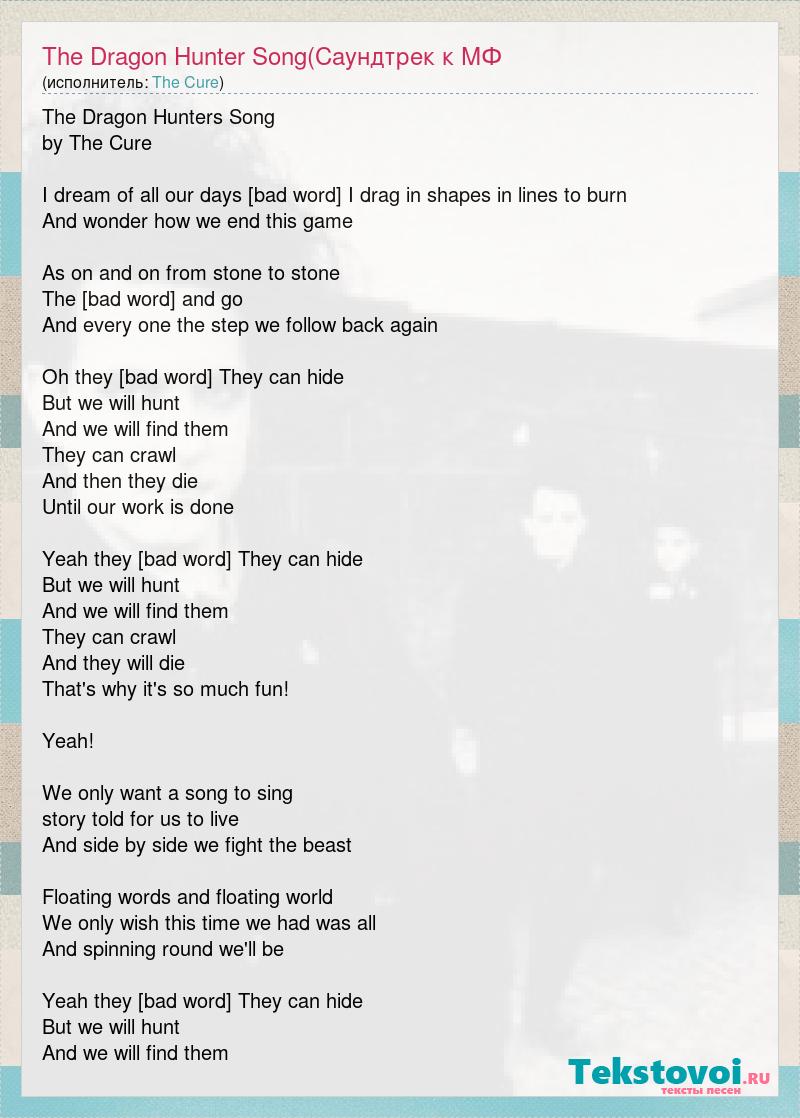 The Dragon Hunters Song by The Cure I dream of all our days to come I drag in shapes in lines to burn And wonder how we end this game As on and on from stone to stone The monsters come and go And every one the step we follow back again Oh they can run They can hide But we will hunt And we will find them They can crawl And then they die Until our work is done Yeah they can run They can hide But we will hunt And we will find them They can crawl And they will die That's why it's so much fun! Yeah! We only want a song to sing story told for us to live And side by side we fight the beast Floating words and floating world We only wish this time we had was all And spinning round we'll be Yeah they can run They can hide But we will hunt And we will find them