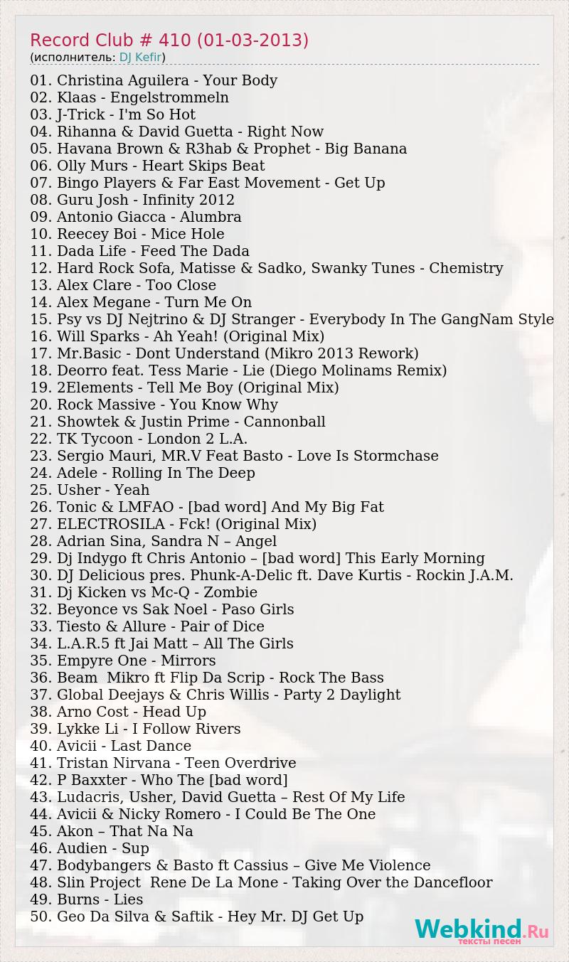 01. Christina Aguilera - Your Body 02. Klaas - Engelstrommeln 03. J-Trick - I'm So Hot 04. Rihanna & David Guetta - Right Now 05. Havana Brown & R3hab & Prophet - Big Banana 06. Olly Murs - Heart Skips Beat 07. Bingo Players & Far East Movement - Get Up 08. Guru Josh - Infinity 2012 09. Antonio Giacca - Alumbra 10. Reecey Boi - Mice Hole 11. Dada Life - Feed The Dada 12. Hard Rock Sofa, Matisse & Sadko, Swanky Tunes - Chemistry 13. Alex Clare - Too Close 14. Alex Megane - Turn Me On 15. Psy vs DJ Nejtrino & DJ Stranger - Everybody In The GangNam Style 16. Will Sparks - Ah Yeah! (Original Mix) 17. Mr.Basic - Dont Understand (Mikro 2013 Rework) 18. Deorro feat. Tess Marie - Lie (Diego Molinams Remix) 19. 2Elements - Tell Me Boy (Original Mix) 20. Rock Massive - You Know Why 21. Showtek & Justin Prime - Cannonball 22. TK Tycoon - London 2 L.A. 23. Sergio Mauri, MR.V Feat Basto - Love Is Stormchase 24. Adele - Rolling In The Deep 25. Usher - Yeah 26. Tonic & LMFAO - [bad word] And My Big Fat 27. ELECTROSILA - Fck! (Original Mix) 28. Adrian Sina, Sandra N – Angel 29. Dj Indygo ft Chris Antonio – [bad word] This Early Morning 30. DJ Delicious pres. Phunk-A-Delic ft. Dave Kurtis - Rockin J.A.M. 31. Dj Kicken vs Mc-Q - Zombie 32. Beyonce vs Sak Noel - Paso Girls 33. Tiesto & Allure - Pair of Dice 34. L.A.R.5 ft Jai Matt – All The Girls 35. Empyre One - Mirrors 36. Beam Mikro ft Flip Da Scrip - Rock The Bass 37. Global Deejays & Chris Willis - Party 2 Daylight 38. Arno Cost - Head Up 39. Lykke Li - I Follow Rivers 40. Avicii - Last Dance 41. Tristan Nirvana - Teen Overdrive 42. P Baxxter - Who The [bad word] 43. Ludacris, Usher, David Guetta – Rest Of My Life 44. Avicii & Nicky Romero - I Could Be The One 45. Akon – That Na Na 46. Audien - Sup 47. Bodybangers & Basto ft Cassius – Give Me Violence 48. Slin Project Rene De La Mone - Taking Over the Dancefloor 49. Burns - Lies 50. Geo Da Silva & Saftik - Hey Mr. DJ Get Up