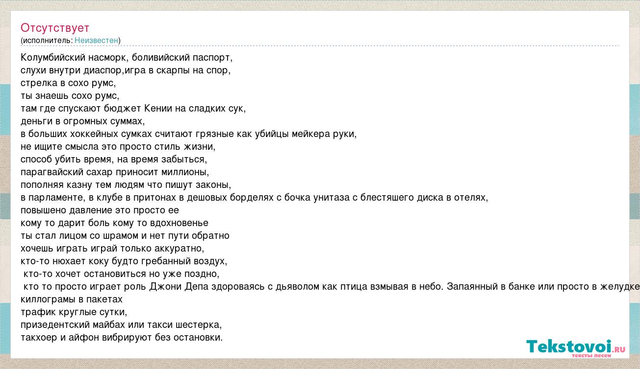 Колумбийский насморк, боливийский паспорт, слухи внутри диаспор,игра в скарпы на спор, стрелка в сохо румс, ты знаешь сохо румс, там где спускают бюджет Кении на сладких сук, деньги в огромных суммах, в больших хоккейных сумках считают грязные как убийцы мейкера руки, не ищите смысла это просто стиль жизни, способ убить время, на время забыться, парагвайский сахар приносит миллионы, пополняя казну тем людям что пишут законы, в парламенте, в клубе в притонах в дешовых борделях с бочка унитаза с блестяшего диска в отелях, повышено давление это просто ее кому то дарит боль кому то вдохновенье ты стал лицом со шрамом и нет пути обратно хочешь играть играй только аккуратно, кто-то нюхает коку будто гребанный воздух, кто-то хочет остановиться но уже поздно, кто то просто играет роль Джони Депа здороваясь с дьяволом как птица взмывая в небо. Запаянный в банке или просто в желудке киллограмы в пакетах трафик круглые сутки, призедентский майбах или такси шестерка, такхоер и айфон вибрируют без остановки.