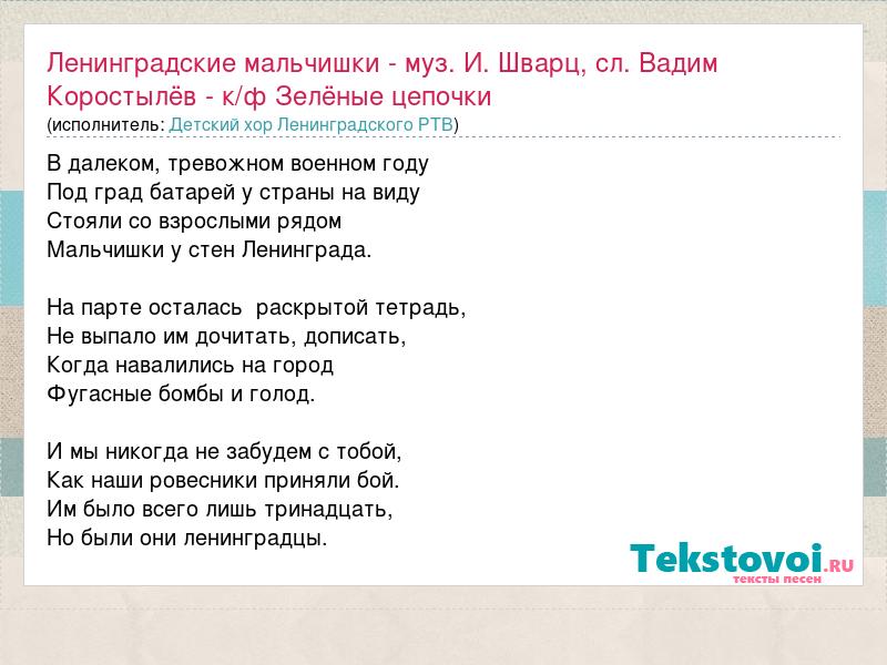 В далеком, тревожном военном году Под град батарей у страны на виду Стояли со взрослыми рядом Мальчишки у стен Ленинграда. На парте осталась раскрытой тетрадь, Не выпало им дочитать, дописать, Когда навалились на город Фугасные бомбы и голод. И мы никогда не забудем с тобой, Как наши ровесники приняли бой. Им было всего лишь тринадцать, Но были они ленинградцы.
