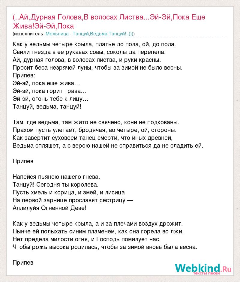 Как у ведьмы четыре крыла, платье до пола, ой, до пола. Свили гнезда в ее рукавах совы, соколы да перепела. Ай, дурная голова, в волосах листва, и руки красны. Просит беса незрячей луны, чтобы за зимой не было весны. Припев: Эй-эй, пока еще жива… Эй-эй, пока горит трава… Эй-эй, огонь тебе к лицу… Танцуй, ведьма, танцуй! Там, где ведьма, там жито не свячено, кони не подкованы. Прахом пусть улетает, бродячая, во четыре, ой, стороны. Как завертит суховеем танец смерти, что иных древней, Ведьма спляшет, а с верою нашей не справиться да не сладить ей. Припев Напейся пьяною нашего гнева. Танцуй! Сегодня ты королева. Пусть хмель и корица, и змей, и лисица На первой зарнице прославят сестрицу — Аллилуйя Огненной Деве! Как у ведьмы четыре крыла, а и за плечами воздух дрожит. Нынче ей полыхать синим пламенем, как она горела во лжи. Нет предела милости огня, и Господь помилует нас, Чтобы рожь высока родилась, чтобы за зимой вновь была весна. Припев