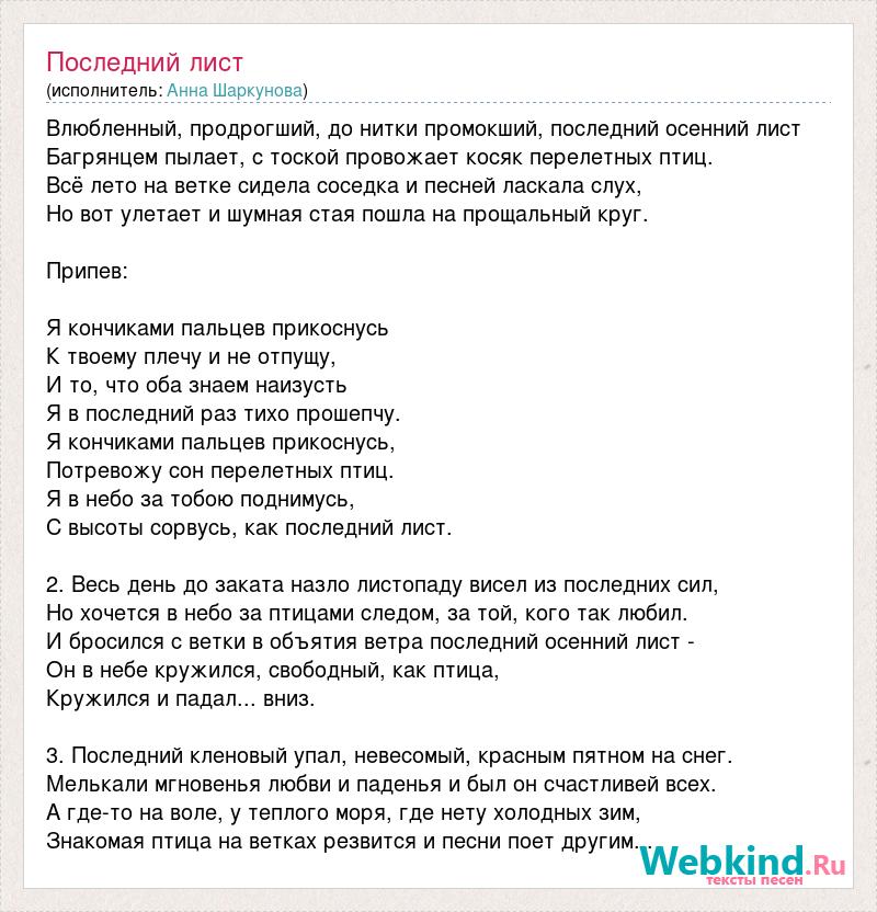 Влюбленный, продрогший, до нитки промокший, последний осенний лист Багрянцем пылает, с тоской провожает косяк перелетных птиц. Всё лето на ветке сидела соседка и песней ласкала слух, Но вот улетает и шумная стая пошла на прощальный круг. Припев: Я кончиками пальцев прикоснусь К твоему плечу и не отпущу, И то, что оба знаем наизусть Я в последний раз тихо прошепчу. Я кончиками пальцев прикоснусь, Потревожу сон перелетных птиц. Я в небо за тобою поднимусь, С высоты сорвусь, как последний лист. 2. Весь день до заката назло листопаду висел из последних сил, Но хочется в небо за птицами следом, за той, кого так любил. И бросился с ветки в объятия ветра последний осенний лист - Он в небе кружился, свободный, как птица, Кружился и падал... вниз. 3. Последний кленовый упал, невесомый, красным пятном на снег. Мелькали мгновенья любви и паденья и был он счастливей всех. А где-то на воле, у теплого моря, где нету холодных зим, Знакомая птица на ветках резвится и песни поет другим...