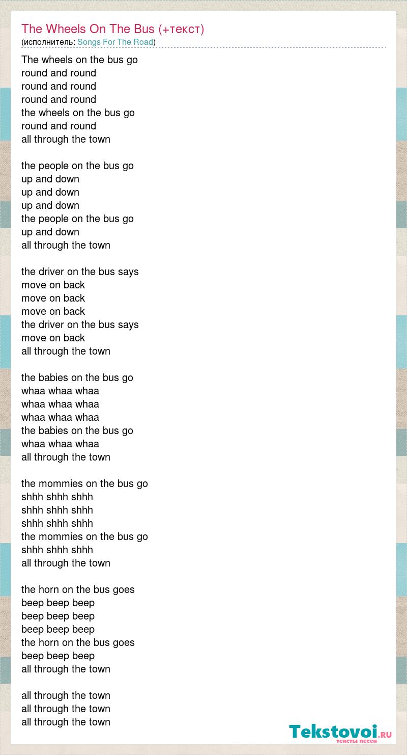 The wheels on the bus go round and round round and round round and round the wheels on the bus go round and round all through the town the people on the bus go up and down up and down up and down the people on the bus go up and down all through the town the driver on the bus says move on back move on back move on back the driver on the bus says move on back all through the town the babies on the bus go whaa whaa whaa whaa whaa whaa whaa whaa whaa the babies on the bus go whaa whaa whaa all through the town the mommies on the bus go shhh shhh shhh shhh shhh shhh shhh shhh shhh the mommies on the bus go shhh shhh shhh all through the town the horn on the bus goes beep beep beep beep beep beep beep beep beep the horn on the bus goes beep beep beep all through the town all through the town all through the town all through the town