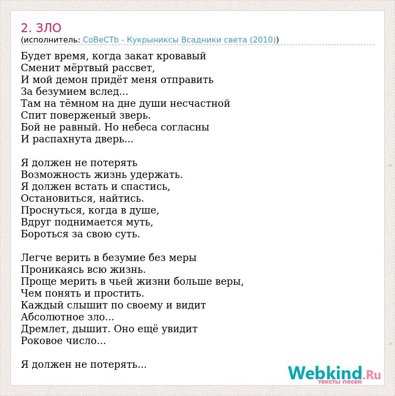 Будет время, когда закат кровавый Сменит мёртвый рассвет, И мой демон придёт меня отправить За безумием вслед... Там на тёмном на дне души несчастной Спит поверженый зверь. Бой не равный. Но небеса согласны И распахнута дверь... Я должен не потерять Возможность жизнь удержать. Я должен встать и спастись, Остановиться, найтись. Проснуться, когда в душе, Вдруг поднимается муть, Бороться за свою суть. Легче верить в безумие без меры Проникаясь всю жизнь. Проще мерить в чьей жизни больше веры, Чем понять и простить. Каждый слышит по своему и видит Абсолютное зло... Дремлет, дышит. Оно ещё увидит Роковое число... Я должен не потерять...