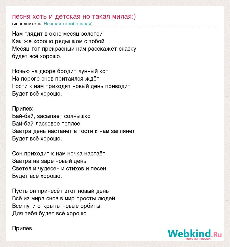 Нам глядит в окно месяц золотой Как же хорошо рядышком с тобой Месяц тот прекрасный нам расскажет сказку будет всё хорошо. Ночью на дворе бродит лунный кот На пороге снов притаился ждёт Гости к нам приходят новый день приводит Будет всё хорошо. Припев: Бай-бай, засыпает солнышко Бай-бай ласковое теплое Завтра день настанет в гости к нам заглянет Будет всё хорошо. Сон приходит к нам ночка настаёт Завтра на заре новый день Светел и чудесен и стихов и песен Будет всё хорошо. Пусть он принесёт этот новый день Всё из мира снов в мир просты людей Все пути открыты новые орбиты Для тебя будет всё хорошо. Припев.