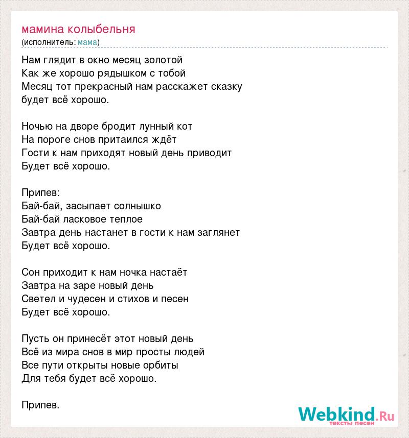 Нам глядит в окно месяц золотой Как же хорошо рядышком с тобой Месяц тот прекрасный нам расскажет сказку будет всё хорошо. Ночью на дворе бродит лунный кот На пороге снов притаился ждёт Гости к нам приходят новый день приводит Будет всё хорошо. Припев: Бай-бай, засыпает солнышко Бай-бай ласковое теплое Завтра день настанет в гости к нам заглянет Будет всё хорошо. Сон приходит к нам ночка настаёт Завтра на заре новый день Светел и чудесен и стихов и песен Будет всё хорошо. Пусть он принесёт этот новый день Всё из мира снов в мир просты людей Все пути открыты новые орбиты Для тебя будет всё хорошо. Припев.