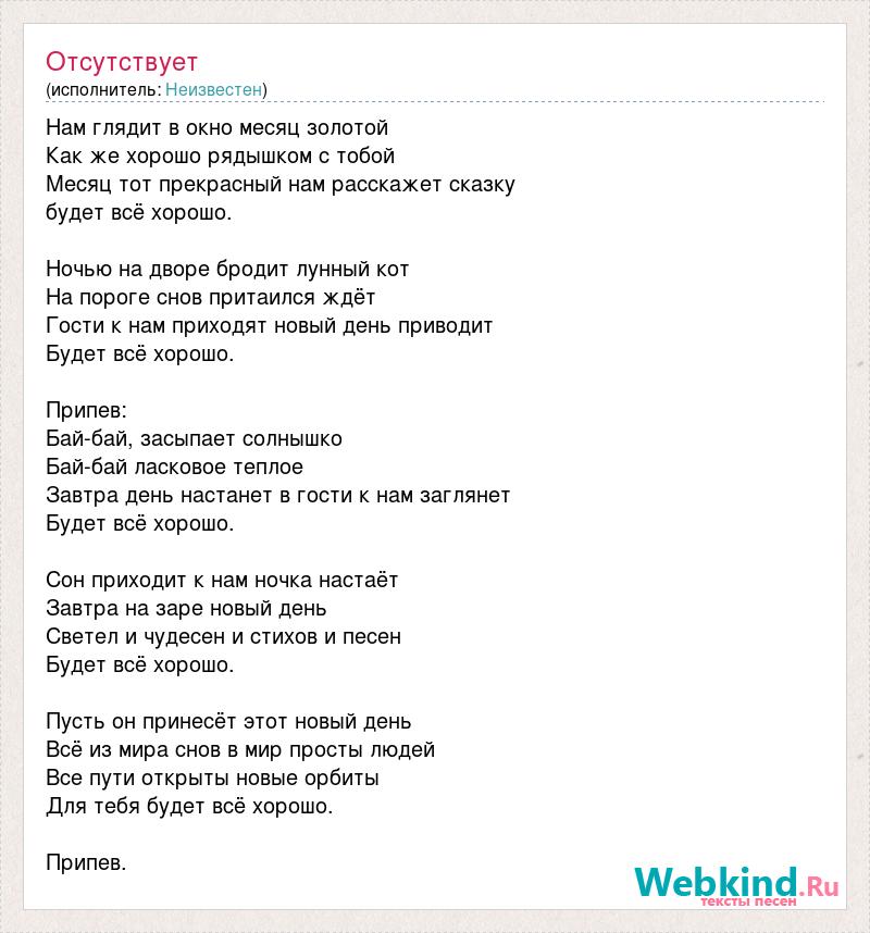 Нам глядит в окно месяц золотой Как же хорошо рядышком с тобой Месяц тот прекрасный нам расскажет сказку будет всё хорошо. Ночью на дворе бродит лунный кот На пороге снов притаился ждёт Гости к нам приходят новый день приводит Будет всё хорошо. Припев: Бай-бай, засыпает солнышко Бай-бай ласковое теплое Завтра день настанет в гости к нам заглянет Будет всё хорошо. Сон приходит к нам ночка настаёт Завтра на заре новый день Светел и чудесен и стихов и песен Будет всё хорошо. Пусть он принесёт этот новый день Всё из мира снов в мир просты людей Все пути открыты новые орбиты Для тебя будет всё хорошо. Припев.