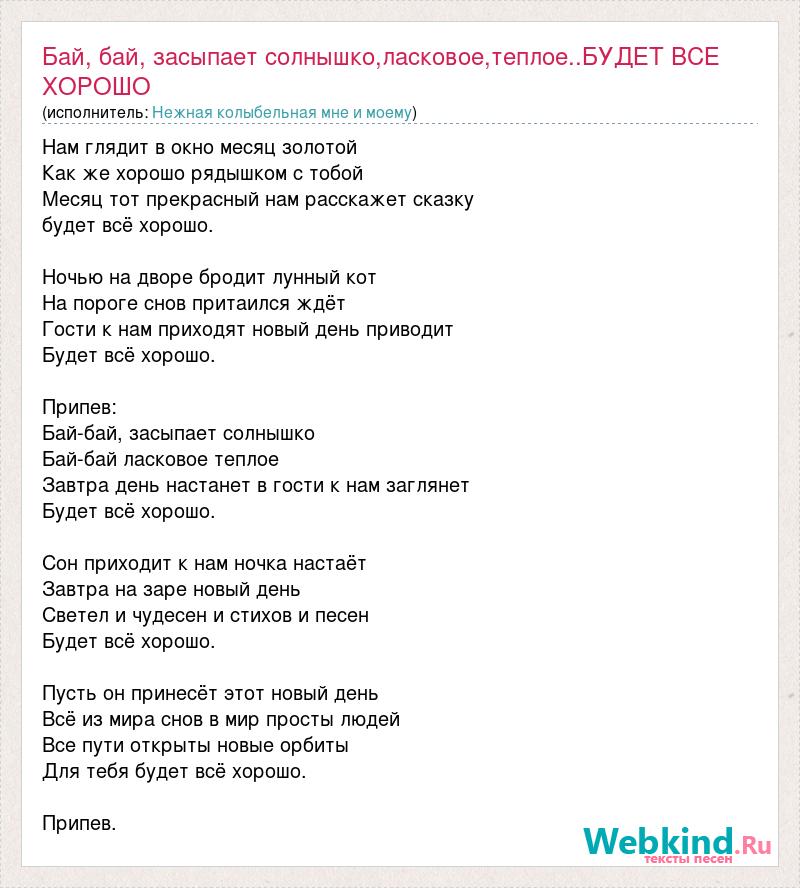Нам глядит в окно месяц золотой Как же хорошо рядышком с тобой Месяц тот прекрасный нам расскажет сказку будет всё хорошо. Ночью на дворе бродит лунный кот На пороге снов притаился ждёт Гости к нам приходят новый день приводит Будет всё хорошо. Припев: Бай-бай, засыпает солнышко Бай-бай ласковое теплое Завтра день настанет в гости к нам заглянет Будет всё хорошо. Сон приходит к нам ночка настаёт Завтра на заре новый день Светел и чудесен и стихов и песен Будет всё хорошо. Пусть он принесёт этот новый день Всё из мира снов в мир просты людей Все пути открыты новые орбиты Для тебя будет всё хорошо. Припев.