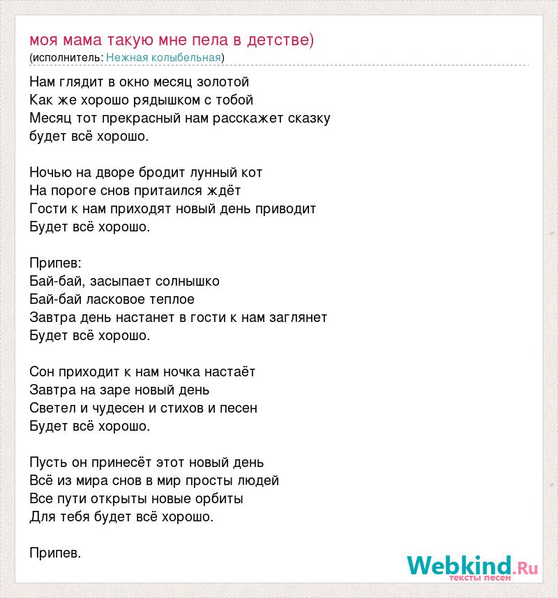 Нам глядит в окно месяц золотой Как же хорошо рядышком с тобой Месяц тот прекрасный нам расскажет сказку будет всё хорошо. Ночью на дворе бродит лунный кот На пороге снов притаился ждёт Гости к нам приходят новый день приводит Будет всё хорошо. Припев: Бай-бай, засыпает солнышко Бай-бай ласковое теплое Завтра день настанет в гости к нам заглянет Будет всё хорошо. Сон приходит к нам ночка настаёт Завтра на заре новый день Светел и чудесен и стихов и песен Будет всё хорошо. Пусть он принесёт этот новый день Всё из мира снов в мир просты людей Все пути открыты новые орбиты Для тебя будет всё хорошо. Припев.