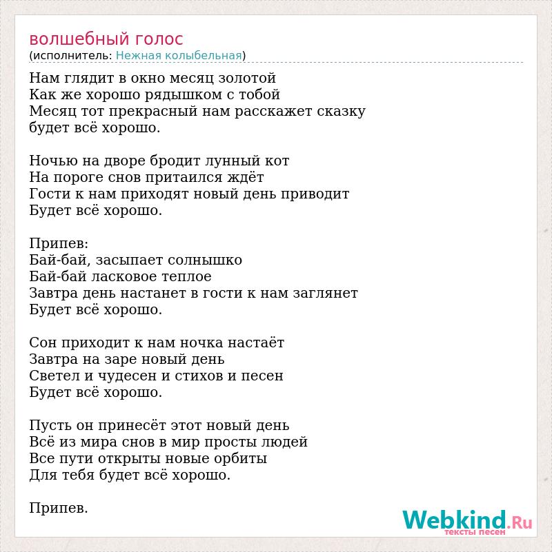 Нам глядит в окно месяц золотой Как же хорошо рядышком с тобой Месяц тот прекрасный нам расскажет сказку будет всё хорошо. Ночью на дворе бродит лунный кот На пороге снов притаился ждёт Гости к нам приходят новый день приводит Будет всё хорошо. Припев: Бай-бай, засыпает солнышко Бай-бай ласковое теплое Завтра день настанет в гости к нам заглянет Будет всё хорошо. Сон приходит к нам ночка настаёт Завтра на заре новый день Светел и чудесен и стихов и песен Будет всё хорошо. Пусть он принесёт этот новый день Всё из мира снов в мир просты людей Все пути открыты новые орбиты Для тебя будет всё хорошо. Припев.