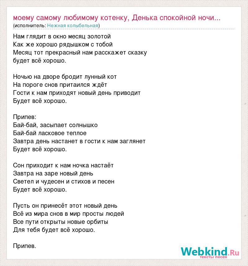 Нам глядит в окно месяц золотой Как же хорошо рядышком с тобой Месяц тот прекрасный нам расскажет сказку будет всё хорошо. Ночью на дворе бродит лунный кот На пороге снов притаился ждёт Гости к нам приходят новый день приводит Будет всё хорошо. Припев: Бай-бай, засыпает солнышко Бай-бай ласковое теплое Завтра день настанет в гости к нам заглянет Будет всё хорошо. Сон приходит к нам ночка настаёт Завтра на заре новый день Светел и чудесен и стихов и песен Будет всё хорошо. Пусть он принесёт этот новый день Всё из мира снов в мир просты людей Все пути открыты новые орбиты Для тебя будет всё хорошо. Припев.