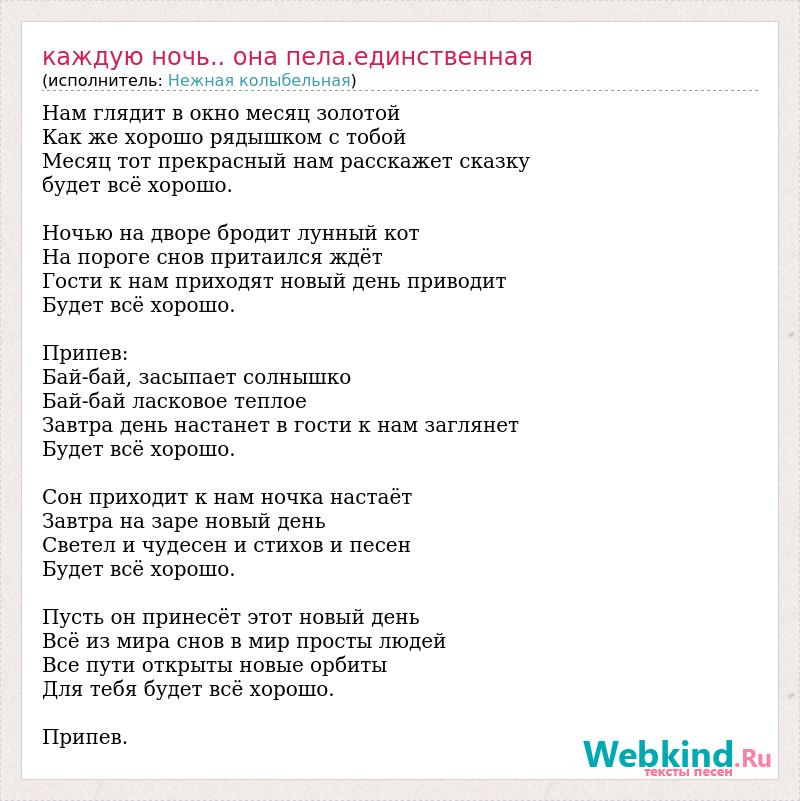 Нам глядит в окно месяц золотой Как же хорошо рядышком с тобой Месяц тот прекрасный нам расскажет сказку будет всё хорошо. Ночью на дворе бродит лунный кот На пороге снов притаился ждёт Гости к нам приходят новый день приводит Будет всё хорошо. Припев: Бай-бай, засыпает солнышко Бай-бай ласковое теплое Завтра день настанет в гости к нам заглянет Будет всё хорошо. Сон приходит к нам ночка настаёт Завтра на заре новый день Светел и чудесен и стихов и песен Будет всё хорошо. Пусть он принесёт этот новый день Всё из мира снов в мир просты людей Все пути открыты новые орбиты Для тебя будет всё хорошо. Припев.