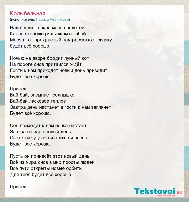 Нам глядит в окно месяц золотой Как же хорошо рядышком с тобой Месяц тот прекрасный нам расскажет сказку будет всё хорошо. Ночью на дворе бродит лунный кот На пороге снов притаился ждёт Гости к нам приходят новый день приводит Будет всё хорошо. Припев: Бай-бай, засыпает солнышко Бай-бай ласковое теплое Завтра день настанет в гости к нам заглянет Будет всё хорошо. Сон приходит к нам ночка настаёт Завтра на заре новый день Светел и чудесен и стихов и песен Будет всё хорошо. Пусть он принесёт этот новый день Всё из мира снов в мир просты людей Все пути открыты новые орбиты Для тебя будет всё хорошо. Припев.