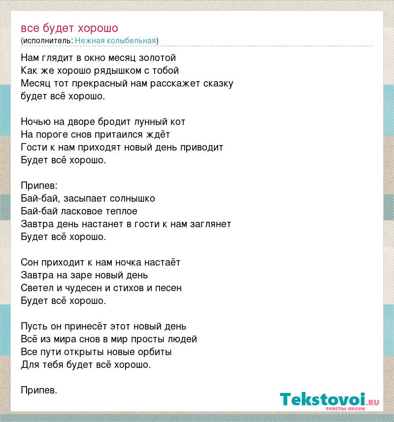 Нам глядит в окно месяц золотой Как же хорошо рядышком с тобой Месяц тот прекрасный нам расскажет сказку будет всё хорошо. Ночью на дворе бродит лунный кот На пороге снов притаился ждёт Гости к нам приходят новый день приводит Будет всё хорошо. Припев: Бай-бай, засыпает солнышко Бай-бай ласковое теплое Завтра день настанет в гости к нам заглянет Будет всё хорошо. Сон приходит к нам ночка настаёт Завтра на заре новый день Светел и чудесен и стихов и песен Будет всё хорошо. Пусть он принесёт этот новый день Всё из мира снов в мир просты людей Все пути открыты новые орбиты Для тебя будет всё хорошо. Припев.