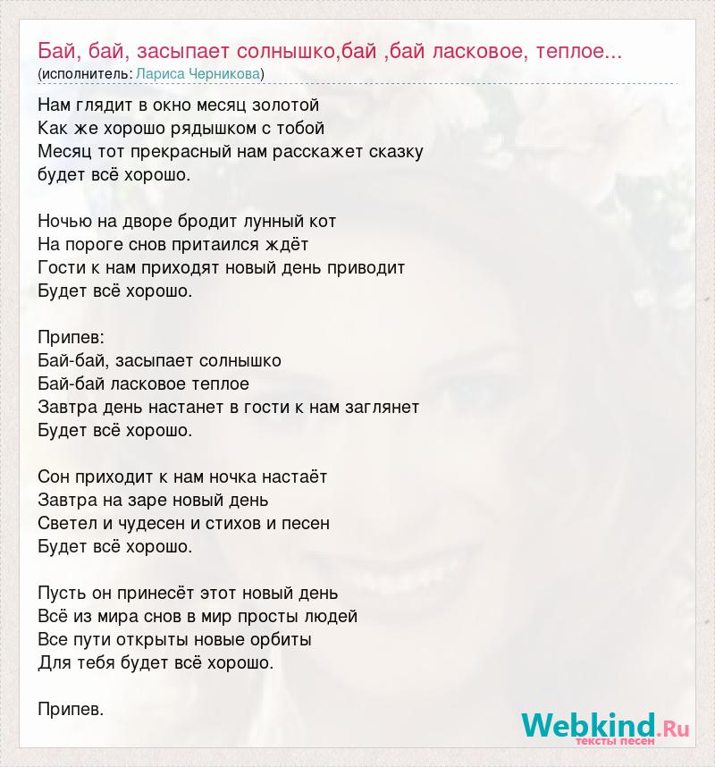 Нам глядит в окно месяц золотой Как же хорошо рядышком с тобой Месяц тот прекрасный нам расскажет сказку будет всё хорошо. Ночью на дворе бродит лунный кот На пороге снов притаился ждёт Гости к нам приходят новый день приводит Будет всё хорошо. Припев: Бай-бай, засыпает солнышко Бай-бай ласковое теплое Завтра день настанет в гости к нам заглянет Будет всё хорошо. Сон приходит к нам ночка настаёт Завтра на заре новый день Светел и чудесен и стихов и песен Будет всё хорошо. Пусть он принесёт этот новый день Всё из мира снов в мир просты людей Все пути открыты новые орбиты Для тебя будет всё хорошо. Припев.