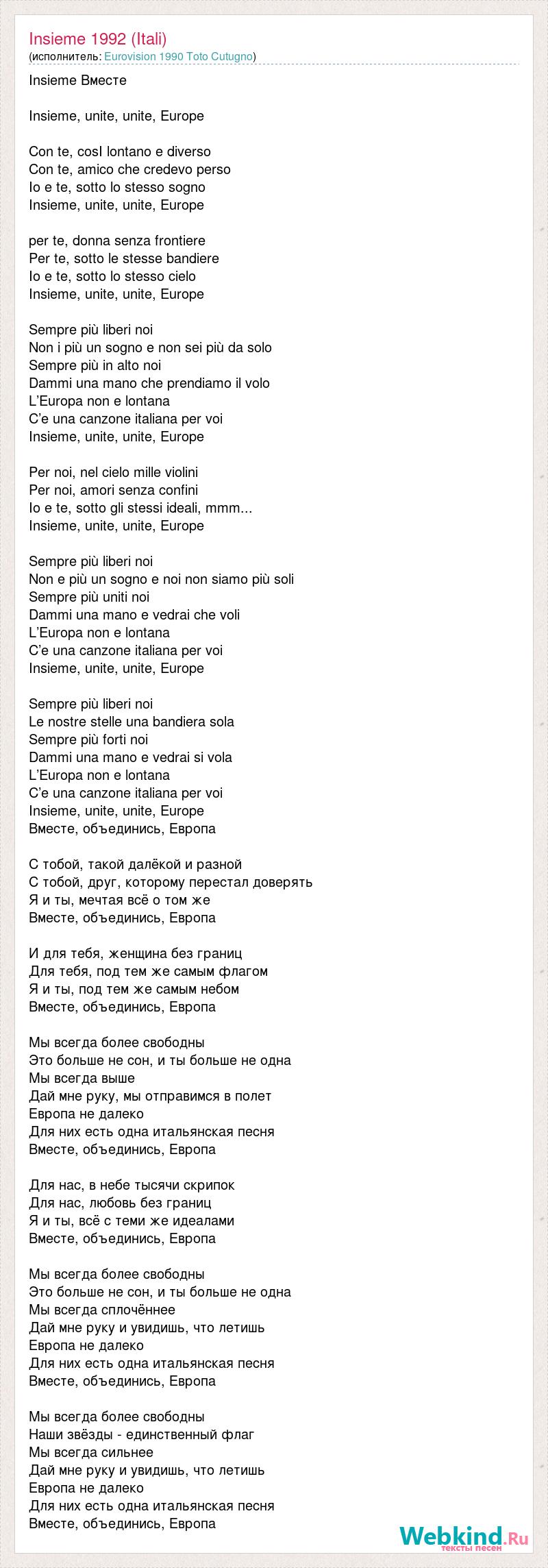Insieme Вместе Insieme, unite, unite, Europe Con te, cosI lontano e diverso Con te, amico che credevo perso Io e te, sotto lo stesso sogno Insieme, unite, unite, Europe per te, donna senza frontiere Per te, sotto le stesse bandiere Io e te, sotto lo stesso cielo Insieme, unite, unite, Europe Sempre più liberi noi Non i più un sogno e non sei più da solo Sempre più in alto noi Dammi una mano che prendiamo il volo L’Europa non e lontana C’e una canzone italiana per voi Insieme, unite, unite, Europe Per noi, nel cielo mille violini Per noi, amori senza confini Io e te, sotto gli stessi ideali, mmm... Insieme, unite, unite, Europe Sempre più liberi noi Non e più un sogno e noi non siamo più soli Sempre più uniti noi Dammi una mano e vedrai che voli L’Europa non e lontana C’e una canzone italiana per voi Insieme, unite, unite, Europe Sempre più liberi noi Le nostre stelle una bandiera sola Sempre più forti noi Dammi una mano e vedrai si vola L’Europa non e lontana C’e una canzone italiana per voi Insieme, unite, unite, Europe Вместе, объединись, Европа С тобой, такой далёкой и разной С тобой, друг, которому перестал доверять Я и ты, мечтая всё о том же Вместе, объединись, Европа И для тебя, женщина без границ Для тебя, под тем же самым флагом Я и ты, под тем же самым небом Вместе, объединись, Европа Мы всегда более свободны Это больше не сон, и ты больше не одна Мы всегда выше Дай мне руку, мы отправимся в полет Европа не далеко Для них есть одна итальянская песня Вместе, объединись, Европа Для нас, в небе тысячи скрипок Для нас, любовь без границ Я и ты, всё с теми же идеалами Вместе, объединись, Европа Мы всегда более свободны Это больше не сон, и ты больше не одна Мы всегда сплочённее Дай мне руку и увидишь, что летишь Европа не далеко Для них есть одна итальянская песня Вместе, объединись, Европа Мы всегда более свободны Наши звёзды - единственный флаг Мы всегда сильнее Дай мне руку и увидишь, что летишь Европа не далеко Для них есть одна итальянская песня Вместе, объединись, Европа