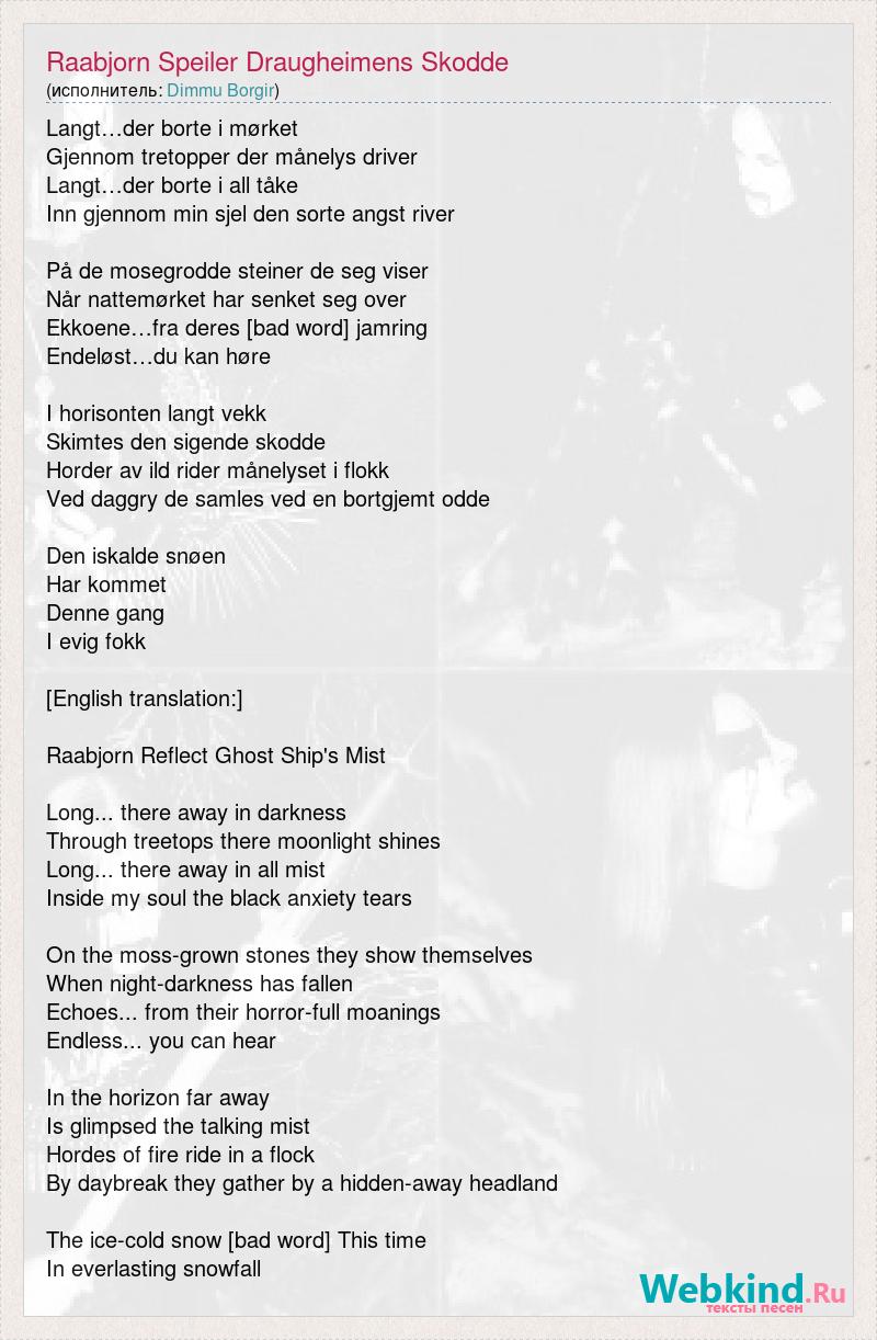 Langt…der borte i mørket Gjennom tretopper der månelys driver Langt…der borte i all tåke Inn gjennom min sjel den sorte angst river På de mosegrodde steiner de seg viser Når nattemørket har senket seg over Ekkoene…fra deres [bad word] jamring Endeløst…du kan høre I horisonten langt vekk Skimtes den sigende skodde Horder av ild rider månelyset i flokk Ved daggry de samles ved en bortgjemt odde Den iskalde snøen Har kommet Denne gang I evig fokk [English translation:] Raabjorn Reflect Ghost Ship's Mist Long... there away in darkness Through treetops there moonlight shines Long... there away in all mist Inside my soul the black anxiety tears On the moss-grown stones they show themselves When night-darkness has fallen Echoes... from their horror-full moanings Endless... you can hear In the horizon far away Is glimpsed the talking mist Hordes of fire ride in a flock By daybreak they gather by a hidden-away headland The ice-cold snow [bad word] This time In everlasting snowfall