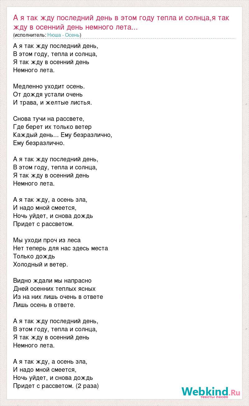 А я так жду последний день, В этом году, тепла и солнца, Я так жду в осенний день Немного лета. Медленно уходит осень. От дождя устали очень И трава, и желтые листья. Снова тучи на рассвете, Где берет их только ветер Каждый день... Ему безразлично, Ему безразлично. А я так жду последний день, В этом году, тепла и солнца, Я так жду в осенний день Немного лета. А я так жду, а осень зла, И надо мной смеется, Ночь уйдет, и снова дождь Придет с рассветом. Мы уходи проч из леса Нет теперь для нас здесь места Только дождь Холодный и ветер. Видно ждали мы напрасно Дней осенних теплых ясных Из на них лишь очень в ответе Лишь осень в ответе. А я так жду последний день, В этом году, тепла и солнца, Я так жду в осенний день Немного лета. А я так жду, а осень зла, И надо мной смеется, Ночь уйдет, и снова дождь Придет с рассветом. (2 раза)