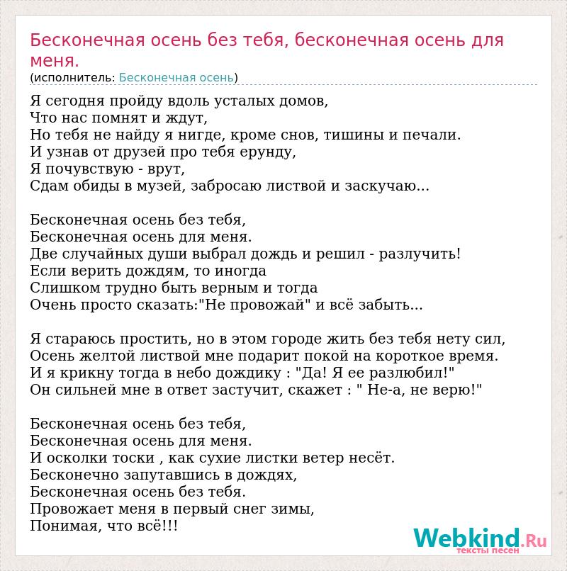Я сегодня пройду вдоль усталых домов, Что нас помнят и ждут, Но тебя не найду я нигде, кроме снов, тишины и печали. И узнав от друзей про тебя ерунду, Я почувствую - врут, Сдам обиды в музей, забросаю листвой и заскучаю... Бесконечная осень без тебя, Бесконечная осень для меня. Две случайных души выбрал дождь и решил - разлучить! Если верить дождям, то иногда Слишком трудно быть верным и тогда Очень просто сказать:"Не провожай" и всё забыть... Я стараюсь простить, но в этом городе жить без тебя нету сил, Осень желтой листвой мне подарит покой на короткое время. И я крикну тогда в небо дождику : "Да! Я ее разлюбил!" Он сильней мне в ответ застучит, скажет : " Не-а, не верю!" Бесконечная осень без тебя, Бесконечная осень для меня. И осколки тоски , как сухие листки ветер несёт. Бесконечно запутавшись в дождях, Бесконечная осень без тебя. Провожает меня в первый снег зимы, Понимая, что всё!!!