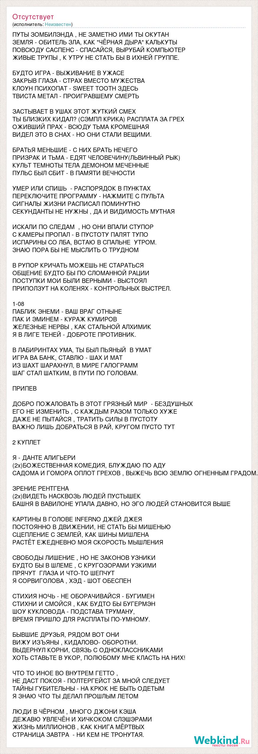 ПУТЫ ЗОМБИЛЭНДА , НЕ ЗАМЕТНО ИМИ ТЫ ОКУТАН ЗЕМЛЯ - ОБИТЕЛЬ ЗЛА, КАК "ЧЁРНАЯ ДЫРА" КАЛЬКУТЫ ПОВСЮДУ САСПЕНС - СПАСАЙСЯ, ВЫРУБАЙ КОМПЬЮТЕР ЖИВЫЕ ТРУПЫ , К УТРУ НЕ СТАТЬ БЫ В ИХНЕЙ ГРУППЕ. БУДТО ИГРА - ВЫЖИВАНИЕ В УЖАСЕ ЗАКРЫВ ГЛАЗА - СТРАХ ВМЕСТО МУЖЕСТВА КЛОУН ПСИХОПАТ - SWEET TOOTH ЗДЕСЬ ТВИСТА МЕТАЛ - ПРОИГРАВШЕМУ СМЕРТЬ ЗАСТЫВАЕТ В УШАХ ЭТОТ ЖУТКИЙ СМЕХ ТЫ БЛИЗКИХ КИДАЛ? (СЭМПЛ КРИКА) РАСПЛАТА ЗА ГРЕХ ОЖИВШИЙ ПРАХ - ВСЮДУ ТЬМА КРОМЕШНАЯ ВИДЕЛ ЭТО В СНАХ - НО ОНИ СТАЛИ ВЕЩИМИ. БРАТЬЯ МЕНЬШИЕ - С НИХ БРАТЬ НЕЧЕГО ПРИЗРАК И ТЬМА - ЕДЯТ ЧЕЛОВЕЧИНУ(ЛЬВИННЫЙ РЫК) КУЛЬТ ТЕМНОТЫ ТЕЛА ДЕМОНОМ МЕЧЕННЫЕ ПУЛЬС БЫЛ СБИТ - В ПАМЯТИ ВЕЧНОСТИ УМЕР ИЛИ СПИШЬ - РАСПОРЯДОК В ПУНКТАХ ПЕРЕКЛЮЧИТЕ ПРОГРАММУ - НАЖМИТЕ С ПУЛЬТА СИГНАЛЫ ЖИЗНИ РАСПИСАЛ ПОМИНУТНО СЕКУНДАНТЫ НЕ НУЖНЫ , ДА И ВИДИМОСТЬ МУТНАЯ ИСКАЛИ ПО СЛЕДАМ , НО ОНИ ВПАЛИ СТУПОР С КАМЕРЫ ПРОПАЛ - В ПУСТОТУ ПАЛЯТ ТУПО ИСПАРИНЫ СО ЛБА, ВСТАЮ В СПАЛЬНЕ УТРОМ. ЗНАЮ ПОРА БЫ НЕ МЫСЛИТЬ О ТРУДНОМ В РУПОР КРИЧАТЬ МОЖЕШЬ НЕ СТАРАТЬСЯ ОБЩЕНИЕ БУДТО БЫ ПО СЛОМАННОЙ РАЦИИ ПОСТУПКИ МОИ БЫЛИ ВЕРНЫМИ - ВЫСТОЯЛ ПРИПОЛЗУТ НА КОЛЕНЯХ - КОНТРОЛЬНЫХ ВЫСТРЕЛ. 1-08 ПАБЛИК ЭНЕМИ - ВАШ ВРАГ ОТНЫНЕ ПАК И ЭМИНЕМ - КУРАЖ КУМИРОВ ЖЕЛЕЗНЫЕ НЕРВЫ , КАК СТАЛЬНОЙ АЛХИМИК Я В ЛИГЕ ТЕНЕЙ - ДОБРОТЕ ПРОТИВНИК. В ЛАБИРИНТАХ УМА, ТЫ БЫЛ ПЬЯНЫЙ В УМАТ ИГРА ВА БАНК, СТАВЛЮ - ШАХ И МАТ ИЗ ШАХТ ШАРАХНУЛ, В МИРЕ ГАЛОГРАММ ШАГ СТАЛ ШАТКИМ, В ПУТИ ПО ГОЛОВАМ. ПРИПЕВ ДОБРО ПОЖАЛОВАТЬ В ЭТОТ ГРЯЗНЫЙ МИР - БЕЗДУШНЫХ ЕГО НЕ ИЗМЕНИТЬ , С КАЖДЫМ РАЗОМ ТОЛЬКО ХУЖЕ ДАЖЕ НЕ ПЫТАЙСЯ , ТРАТИТЬ СИЛЫ В ПУСТОТУ ВАЖНО ЛИШЬ ДОБРАТЬСЯ В РАЙ, КРУГОМ ПУСТО ТУТ 2 КУПЛЕТ Я - ДАНТЕ АЛИГЬЕРИ (2x)БОЖЕСТВЕННАЯ КОМЕДИЯ, БЛУЖДАЮ ПО АДУ САДОМА И ГОМОРА ОПЛОТ ГРЕХОВ , ВЫЖЕЧЬ ВСЮ ЗЕМЛЮ ОГНЕННЫМ ГРАДОМ. ЗРЕНИЕ РЕНТГЕНА (2x)ВИДЕТЬ НАСКВОЗЬ ЛЮДЕЙ ПУСТЫШЕК БАШНЯ В ВАВИЛОНЕ УПАЛА ДАВНО, НО ЭГО ЛЮДЕЙ СТАНОВИТСЯ ВЫШЕ КАРТИНЫ В ГОЛОВЕ INFERNO ДЖЕЙ ДЖЕЯ ПОСТОЯННО В ДВИЖЕНИИ, НЕ СТАТЬ БЫ МИШЕНЬЮ СЦЕПЛЕНИЕ С ЗЕМЛЕЙ, КАК ШИНЫ МИШЛЕНА РАСТЁТ ЕЖЕДНЕВНО МОЯ СКОРОСТЬ МЫШЛЕНИЯ СВОБОДЫ ЛИШЕНИЕ , НО НЕ ЗАКОНОВ УЗНИКИ БУДТО БЫ В ШЛЕМЕ , С КРУГОЗОРАМИ УЗКИМИ ПРЯЧУТ ГЛАЗА И ЧТО-ТО ШЕПЧУТ Я СОРВИГОЛОВА , ХЭД - ШОТ ОБЕСПЕН СТИХИЯ НОЧЬ - НЕ ОБОРАЧИВАЙСЯ - БУГИМЕН СТИХНИ И СМОЙСЯ , КАК БУДТО БЫ БУГЕРМЭН ШОУ КУКЛОВОДА - ПОДСТАВА ТРУМАНУ, ВРЕМЯ ПРИШЛО ДЛЯ РАСПЛАТЫ ПО-УМНОМУ. БЫВШИЕ ДРУЗЬЯ, РЯДОМ ВОТ ОНИ ВИЖУ ИЗЪЯНЫ , КИДАЛОВО- ОБОРОТНИ. ВЫДЕРНУЛ КОРНИ, СВЯЗЬ С ОДНОКЛАССНИКАМИ ХОТЬ СТАВЬТЕ В УКОР, ПОЛЮБОМУ МНЕ КЛАСТЬ НА НИХ! ЧТО ТО ИНОЕ ВО ВНУТРЕМ ГЕТТО , НЕ ДАСТ ПОКОЯ - ПОЛТЕРГЕЙСТ ЗА МНОЙ СЛЕДУЕТ ТАЙНЫ ГУБИТЕЛЬНЫ - НА КРЮК НЕ БЫТЬ ОДЕТЫМ Я ЗНАЮ ЧТО ТЫ ДЕЛАЛ ПРОШЛЫМ ЛЕТОМ ЛЮДИ В ЧЁРНОМ , МНОГО ДЖОНИ КЭША ДЕЖАВЮ УВЛЕЧЁН И ХИЧКОКОМ СЛЭШЭРАМИ ЖИЗНЬ МИЛЛИОНОВ , КАК КНИГА МЁРТВЫХ СТРАНИЦА ЗАВТРА - НИ КЕМ НЕ ТРОНУТАЯ.