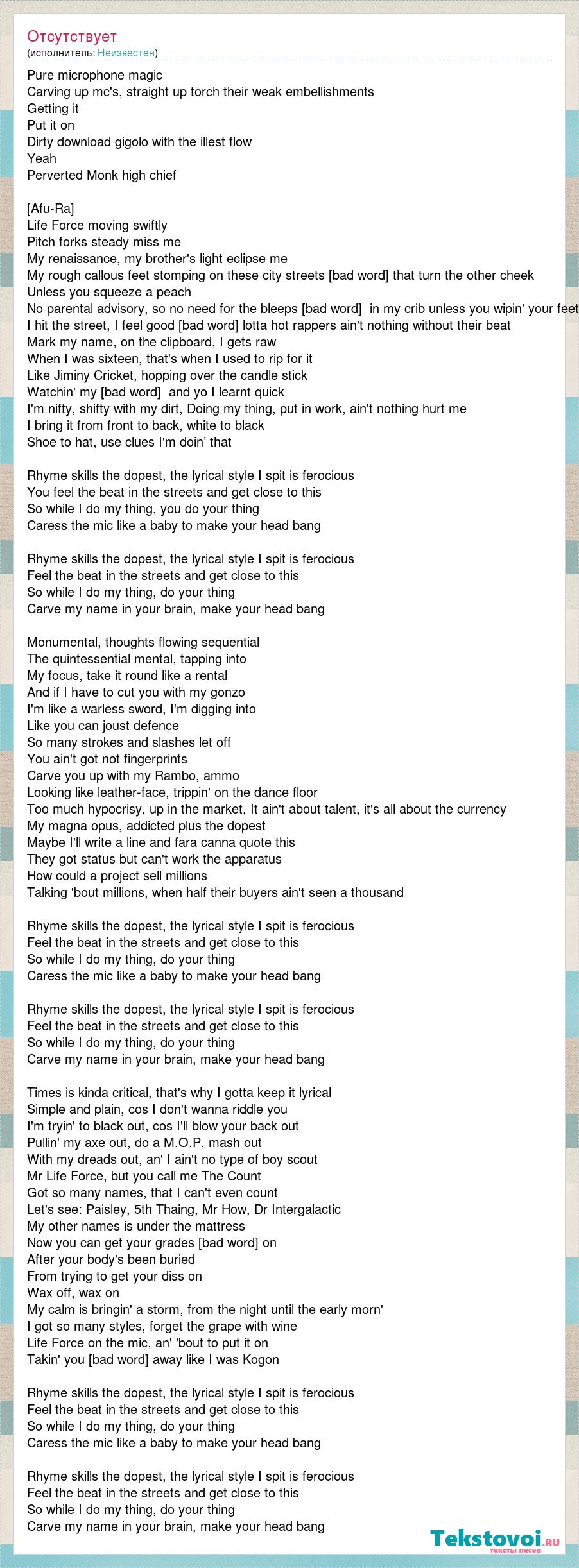 Pure microphone magic Carving up mc's, straight up torch their weak embellishments Getting it Put it on Dirty download gigolo with the illest flow Yeah Perverted Monk high chief [Afu-Ra] Life Force moving swiftly Pitch forks steady miss me My renaissance, my brother's light eclipse me My rough callous feet stomping on these city streets [bad word] that turn the other cheek Unless you squeeze a peach No parental advisory, so no need for the bleeps No comin' in my crib unless you wipin' your feet I hit the street, I feel good plus complete lotta hot rappers ain't nothing without their beat Mark my name, on the clipboard, I gets raw When I was sixteen, that's when I used to rip for it Like Jiminy Cricket, hopping over the candle stick Watchin' my [bad word] and yo I learnt quick I'm nifty, shifty with my dirt, Doing my thing, put in work, ain't nothing hurt me I bring it from front to back, white to black Shoe to hat, use clues I'm doin’ that Rhyme skills the dopest, the lyrical style I spit is ferocious You feel the beat in the streets and get close to this So while I do my thing, you do your thing Caress the mic like a baby to make your head bang Rhyme skills the dopest, the lyrical style I spit is ferocious Feel the beat in the streets and get close to this So while I do my thing, do your thing Carve my name in your brain, make your head bang Monumental, thoughts flowing sequential The quintessential mental, tapping into My focus, take it round like a rental And if I have to cut you with my gonzo I'm like a warless sword, I'm digging into Like you can joust defence So many strokes and slashes let off You ain't got not fingerprints Carve you up with my Rambo, ammo Looking like leather-face, trippin' on the dance floor Too much hypocrisy, up in the market, It ain't about talent, it's all about the currency My magna opus, addicted plus the dopest Maybe I'll write a line and fara canna quote this They got status but can't work the apparatus How could a project sell millions Talking 'bout millions, when half their buyers ain't seen a thousand Rhyme skills the dopest, the lyrical style I spit is ferocious Feel the beat in the streets and get close to this So while I do my thing, do your thing Caress the mic like a baby to make your head bang Rhyme skills the dopest, the lyrical style I spit is ferocious Feel the beat in the streets and get close to this So while I do my thing, do your thing Carve my name in your brain, make your head bang Times is kinda critical, that's why I gotta keep it lyrical Simple and plain, cos I don't wanna riddle you I'm tryin' to black out, cos I'll blow your back out Pullin' my axe out, do a M.O.P. mash out With my dreads out, an' I ain't no type of boy scout Mr Life Force, but you call me The Count Got so many names, that I can't even count Let's see: Paisley, 5th Thaing, Mr How, Dr Intergalactic My other names is under the mattress Now you can get your grades [bad word] on After your body's been buried From trying to get your diss on Wax off, wax on My calm is bringin' a storm, from the night until the early morn' I got so many styles, forget the grape with wine Life Force on the mic, an' 'bout to put it on Takin' you [bad word] away like I was Kogon Rhyme skills the dopest, the lyrical style I spit is ferocious Feel the beat in the streets and get close to this So while I do my thing, do your thing Caress the mic like a baby to make your head bang Rhyme skills the dopest, the lyrical style I spit is ferocious Feel the beat in the streets and get close to this So while I do my thing, do your thing Carve my name in your brain, make your head bang