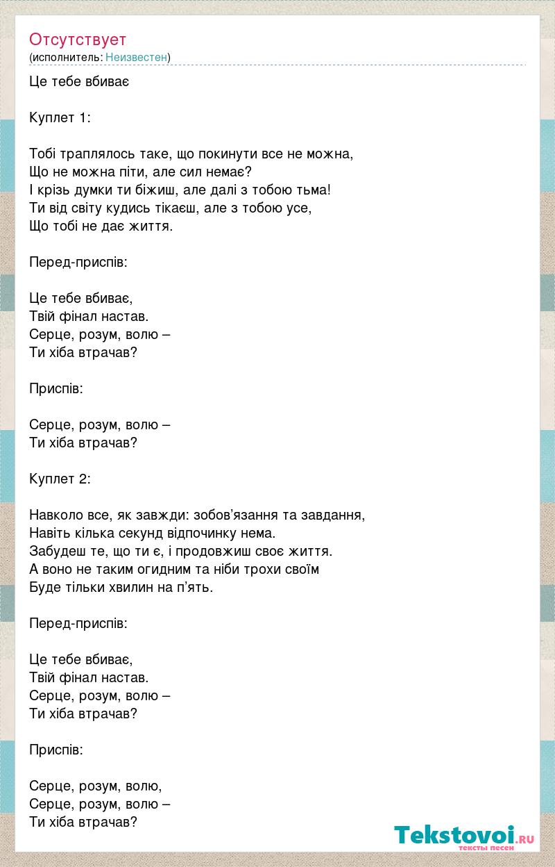 Це тебе вбиває Куплет 1: Тобі траплялось таке, що покинути все не можна, Що не можна піти, але сил немає? І крізь думки ти біжиш, але далі з тобою тьма! Ти від світу кудись тікаєш, але з тобою усе, Що тобі не дає життя. Перед-приспів: Це тебе вбиває, Твій фінал настав. Серце, розум, волю – Ти хіба втрачав? Приспів: Серце, розум, волю – Ти хіба втрачав? Куплет 2: Навколо все, як завжди: зобов’язання та завдання, Навіть кілька секунд відпочинку нема. Забудеш те, що ти є, і продовжиш своє життя. А воно не таким огидним та ніби трохи своїм Буде тільки хвилин на п’ять. Перед-приспів: Це тебе вбиває, Твій фінал настав. Серце, розум, волю – Ти хіба втрачав? Приспів: Серце, розум, волю, Серце, розум, волю – Ти хіба втрачав?