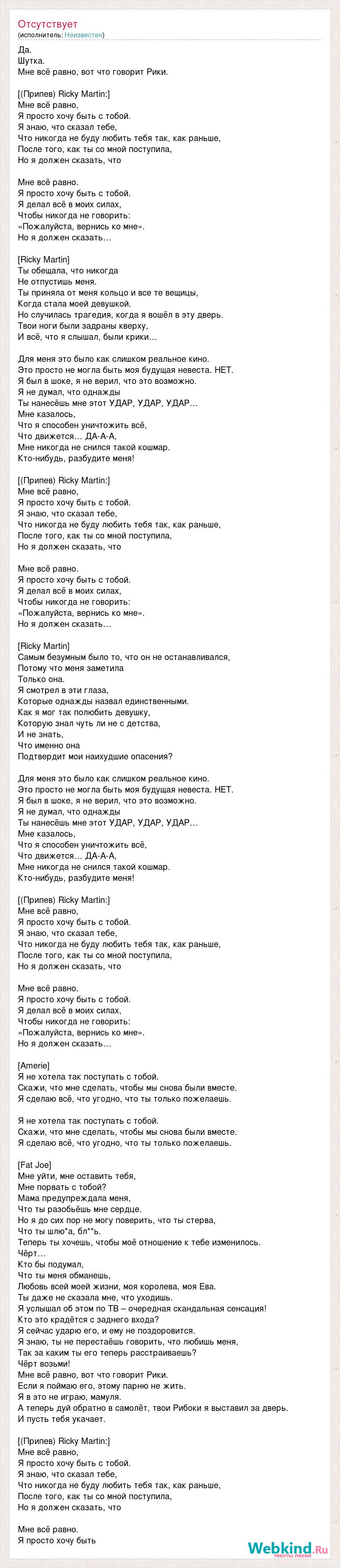 Да. Шутка. Мне всё равно, вот что говорит Рики. [(Припев) Ricky Martin:] Мне всё равно, Я просто хочу быть с тобой. Я знаю, что сказал тебе, Что никогда не буду любить тебя так, как раньше, После того, как ты со мной поступила, Но я должен сказать, что Мне всё равно. Я просто хочу быть с тобой. Я делал всё в моих силах, Чтобы никогда не говорить: «Пожалуйста, вернись ко мне». Но я должен сказать… [Ricky Martin] Ты обещала, что никогда Не отпустишь меня. Ты приняла от меня кольцо и все те вещицы, Когда стала моей девушкой. Но случилась трагедия, когда я вошёл в эту дверь. Твои ноги были задраны кверху, И всё, что я слышал, были крики… Для меня это было как слишком реальное кино. Это просто не могла быть моя будущая невеста. НЕТ. Я был в шоке, я не верил, что это возможно. Я не думал, что однажды Ты нанесёшь мне этот УДАР, УДАР, УДАР… Мне казалось, Что я способен уничтожить всё, Что движется… ДА-А-А, Мне никогда не снился такой кошмар. Кто-нибудь, разбудите меня! [(Припев) Ricky Martin:] Мне всё равно, Я просто хочу быть с тобой. Я знаю, что сказал тебе, Что никогда не буду любить тебя так, как раньше, После того, как ты со мной поступила, Но я должен сказать, что Мне всё равно. Я просто хочу быть с тобой. Я делал всё в моих силах, Чтобы никогда не говорить: «Пожалуйста, вернись ко мне». Но я должен сказать… [Ricky Martin] Самым безумным было то, что он не останавливался, Потому что меня заметила Только она. Я смотрел в эти глаза, Которые однажды назвал единственными. Как я мог так полюбить девушку, Которую знал чуть ли не с детства, И не знать, Что именно она Подтвердит мои наихудшие опасения? Для меня это было как слишком реальное кино. Это просто не могла быть моя будущая невеста. НЕТ. Я был в шоке, я не верил, что это возможно. Я не думал, что однажды Ты нанесёшь мне этот УДАР, УДАР, УДАР… Мне казалось, Что я способен уничтожить всё, Что движется… ДА-А-А, Мне никогда не снился такой кошмар. Кто-нибудь, разбудите меня! [(Припев) Ricky Martin:] Мне всё равно, Я просто хочу быть с тобой. Я знаю, что сказал тебе, Что никогда не буду любить тебя так, как раньше, После того, как ты со мной поступила, Но я должен сказать, что Мне всё равно. Я просто хочу быть с тобой. Я делал всё в моих силах, Чтобы никогда не говорить: «Пожалуйста, вернись ко мне». Но я должен сказать… [Amerie] Я не хотела так поступать с тобой. Скажи, что мне сделать, чтобы мы снова были вместе. Я сделаю всё, что угодно, что ты только пожелаешь. Я не хотела так поступать с тобой. Скажи, что мне сделать, чтобы мы снова были вместе. Я сделаю всё, что угодно, что ты только пожелаешь. [Fat Joe] Мне уйти, мне оставить тебя, Мне порвать с тобой? Мама предупреждала меня, Что ты разобьёшь мне сердце. Но я до сих пор не могу поверить, что ты стерва, Что ты шлю*а, бл**ь. Теперь ты хочешь, чтобы моё отношение к тебе изменилось. Чёрт… Кто бы подумал, Что ты меня обманешь, Любовь всей моей жизни, моя королева, моя Ева. Ты даже не сказала мне, что уходишь. Я услышал об этом по ТВ – очередная скандальная сенсация! Кто это крадётся с заднего входа? Я сейчас ударю его, и ему не поздоровится. Я знаю, ты не перестаёшь говорить, что любишь меня, Так за каким ты его теперь расстраиваешь? Чёрт возьми! Мне всё равно, вот что говорит Рики. Если я поймаю его, этому парню не жить. Я в это не играю, мамуля. А теперь дуй обратно в самолёт, твои Рибоки я выставил за дверь. И пусть тебя укачает. [(Припев) Ricky Martin:] Мне всё равно, Я