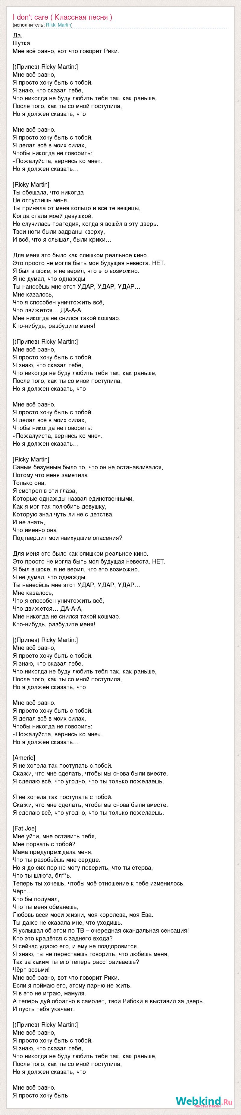 Да. Шутка. Мне всё равно, вот что говорит Рики. [(Припев) Ricky Martin:] Мне всё равно, Я просто хочу быть с тобой. Я знаю, что сказал тебе, Что никогда не буду любить тебя так, как раньше, После того, как ты со мной поступила, Но я должен сказать, что Мне всё равно. Я просто хочу быть с тобой. Я делал всё в моих силах, Чтобы никогда не говорить: «Пожалуйста, вернись ко мне». Но я должен сказать… [Ricky Martin] Ты обещала, что никогда Не отпустишь меня. Ты приняла от меня кольцо и все те вещицы, Когда стала моей девушкой. Но случилась трагедия, когда я вошёл в эту дверь. Твои ноги были задраны кверху, И всё, что я слышал, были крики… Для меня это было как слишком реальное кино. Это просто не могла быть моя будущая невеста. НЕТ. Я был в шоке, я не верил, что это возможно. Я не думал, что однажды Ты нанесёшь мне этот УДАР, УДАР, УДАР… Мне казалось, Что я способен уничтожить всё, Что движется… ДА-А-А, Мне никогда не снился такой кошмар. Кто-нибудь, разбудите меня! [(Припев) Ricky Martin:] Мне всё равно, Я просто хочу быть с тобой. Я знаю, что сказал тебе, Что никогда не буду любить тебя так, как раньше, После того, как ты со мной поступила, Но я должен сказать, что Мне всё равно. Я просто хочу быть с тобой. Я делал всё в моих силах, Чтобы никогда не говорить: «Пожалуйста, вернись ко мне». Но я должен сказать… [Ricky Martin] Самым безумным было то, что он не останавливался, Потому что меня заметила Только она. Я смотрел в эти глаза, Которые однажды назвал единственными. Как я мог так полюбить девушку, Которую знал чуть ли не с детства, И не знать, Что именно она Подтвердит мои наихудшие опасения? Для меня это было как слишком реальное кино. Это просто не могла быть моя будущая невеста. НЕТ. Я был в шоке, я не верил, что это возможно. Я не думал, что однажды Ты нанесёшь мне этот УДАР, УДАР, УДАР… Мне казалось, Что я способен уничтожить всё, Что движется… ДА-А-А, Мне никогда не снился такой кошмар. Кто-нибудь, разбудите меня! [(Припев) Ricky Martin:] Мне всё равно, Я просто хочу быть с тобой. Я знаю, что сказал тебе, Что никогда не буду любить тебя так, как раньше, После того, как ты со мной поступила, Но я должен сказать, что Мне всё равно. Я просто хочу быть с тобой. Я делал всё в моих силах, Чтобы никогда не говорить: «Пожалуйста, вернись ко мне». Но я должен сказать… [Amerie] Я не хотела так поступать с тобой. Скажи, что мне сделать, чтобы мы снова были вместе. Я сделаю всё, что угодно, что ты только пожелаешь. Я не хотела так поступать с тобой. Скажи, что мне сделать, чтобы мы снова были вместе. Я сделаю всё, что угодно, что ты только пожелаешь. [Fat Joe] Мне уйти, мне оставить тебя, Мне порвать с тобой? Мама предупреждала меня, Что ты разобьёшь мне сердце. Но я до сих пор не могу поверить, что ты стерва, Что ты шлю*а, бл**ь. Теперь ты хочешь, чтобы моё отношение к тебе изменилось. Чёрт… Кто бы подумал, Что ты меня обманешь, Любовь всей моей жизни, моя королева, моя Ева. Ты даже не сказала мне, что уходишь. Я услышал об этом по ТВ – очередная скандальная сенсация! Кто это крадётся с заднего входа? Я сейчас ударю его, и ему не поздоровится. Я знаю, ты не перестаёшь говорить, что любишь меня, Так за каким ты его теперь расстраиваешь? Чёрт возьми! Мне всё равно, вот что говорит Рики. Если я поймаю его, этому парню не жить. Я в это не играю, мамуля. А теперь дуй обратно в самолёт, твои Рибоки я выставил за дверь. И пусть тебя укачает. [(Припев) Ricky Martin:] Мне всё равно, Я
