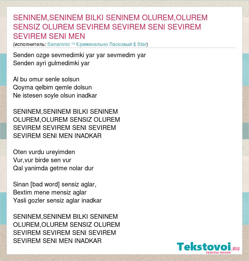 Senden ozge sevmedimki yar yar sevmedim yar Senden ayri gulmedimki yar Al bu omur senle solsun Qoyma qelbim qemle dolsun Ne istesen soyle olsun inadkar SENINEM,SENINEM BILKI SENINEM OLUREM,OLUREM SENSIZ OLUREM SEVIREM SEVIREM SENI SEVIREM SEVIREM SENI MEN INADKAR Oten vurdu ureyimden Vur,vur birde sen vur Qal yanimda getme nolar dur Sinan qurur sensiz aglar, Bextim mene mensiz aglar Yasli gozler sensiz aglar inadkar SENINEM,SENINEM BILKI SENINEM OLUREM,OLUREM SENSIZ OLUREM SEVIREM SEVIREM SENI SEVIREM SEVIREM SENI MEN INADKAR